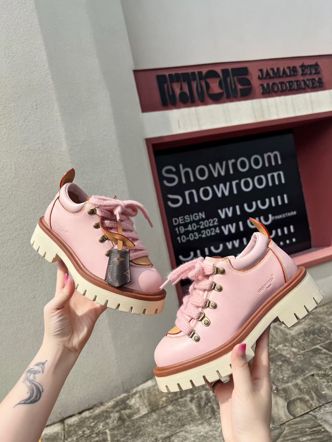 Louis Vuitton 高仿厚底休閒鞋,粉嫩色系鞋身,散發甜美氣質,搭配品牌 Monogram 吊飾,低調展現奢華品味。厚底齒狀鞋底,帶來穩定支撐與舒適腳感。粉色粗繩鞋帶與金屬鞋眼設計,結合木紋層次細節,打造獨特街頭感。這雙鞋既能搭配少女系穿搭,也能混搭潮流風格,是時尚愛好者的必備單品。