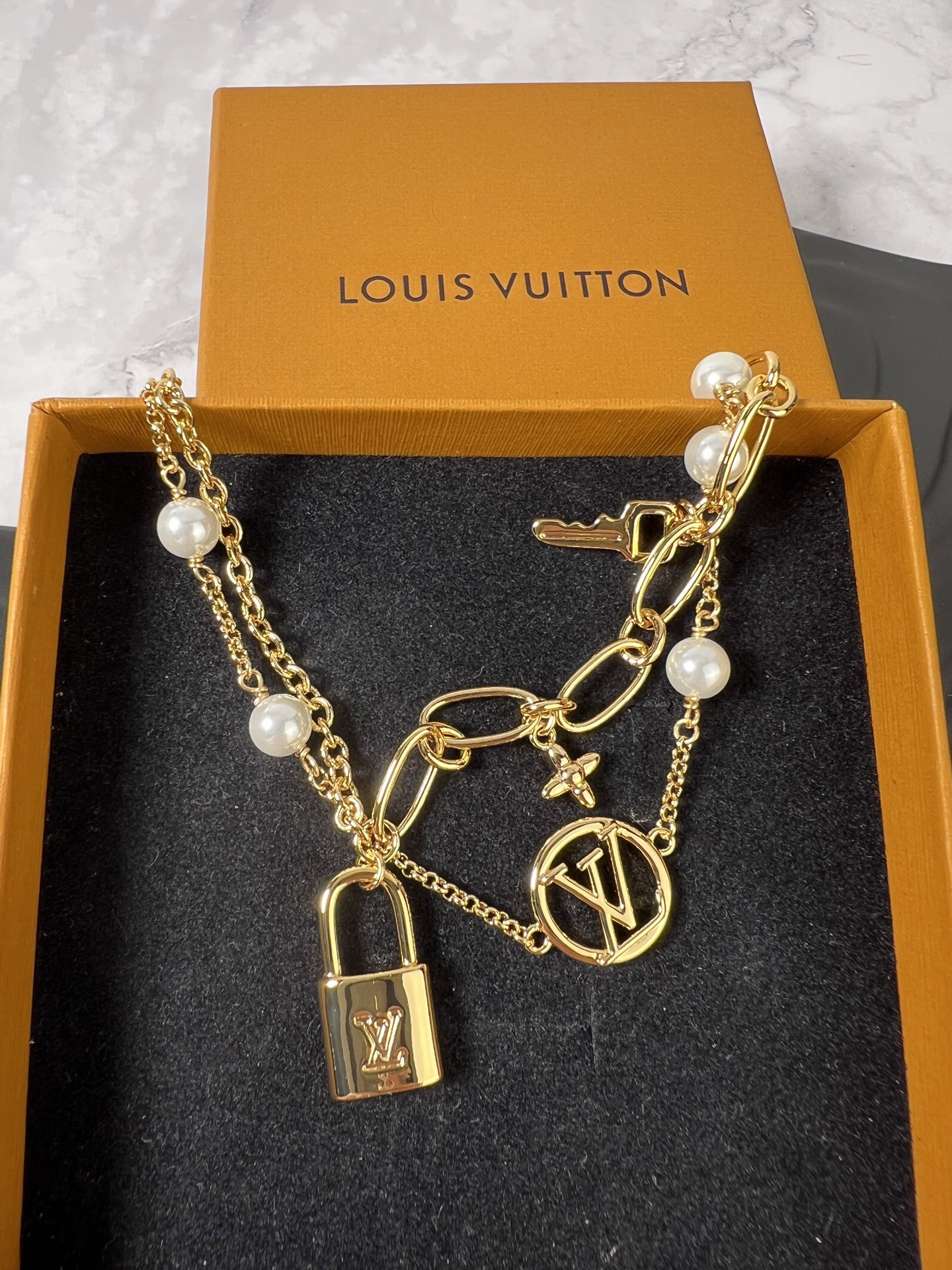 多位買家給出五星評價,表示實物質感優於預期。此款 LV 高仿金色珍珠鎖頭手鍊,採用亮澤金色金屬搭配圓潤人造珍珠,並以 LV Logo、鎖頭、鑰匙及花形吊飾點綴,層次豐富且具品牌辨識度。鏈節與細鏈結合的雙層設計,呈現優雅與時尚兼具的造型。佩戴舒適且不易脫落,適合日常、聚會與正式場合使用。顧客反饋「細節精緻度高,與專櫃款幾乎無差異」。