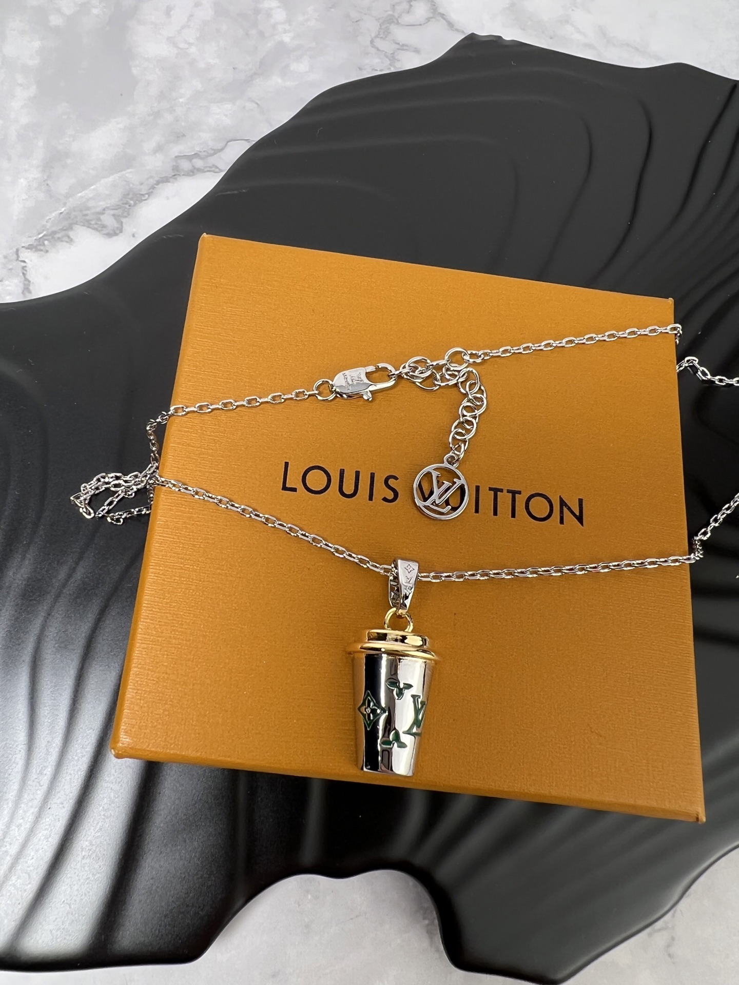 此款 LV 高仿金色飲料杯吊墜項鍊以獨特趣味的飲料杯造型為亮點,搭配經典 Monogram 圖案與品牌 Logo,展現年輕活力與時尚態度。吊墜採用亮澤金色與銀色雙色電鍍工藝,色澤持久且不易褪色,鏈條細緻光滑,佩戴舒適。趣味與高級感並存,適合日常休閒與街頭風格穿搭。顧客反饋「造型新奇、細節精緻,與專櫃款相似度極高」。