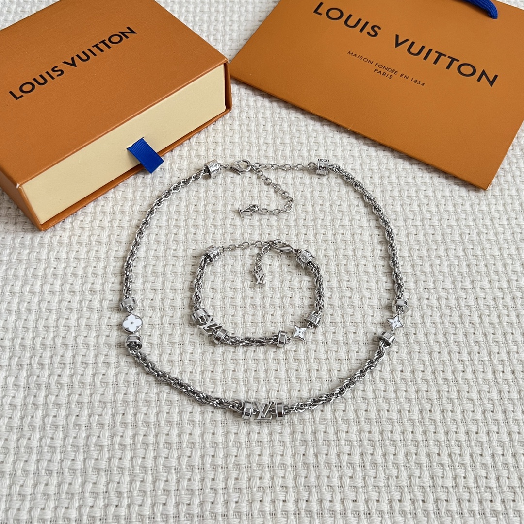 此款 LV 高仿女士銀色項鍊與手鏈套裝深受買家好評,整體採用高亮度不銹鋼材質製作,表面經精細拋光處理,光澤細膩且耐磨抗氧化。鏈節間點綴 LV 經典 Logo 及 Monogram 花型元素,搭配立體刻字工藝,展現品牌辨識度與高級感。項鍊長度可調節,手鏈佩戴舒適不勒手,適合多種場合佩戴。多位顧客反饋「質感與專櫃相差無幾,鏈條順滑,細節做工很到位」,不論日常穿搭還是正式宴會都能輕鬆駕馭。 商品說明:
