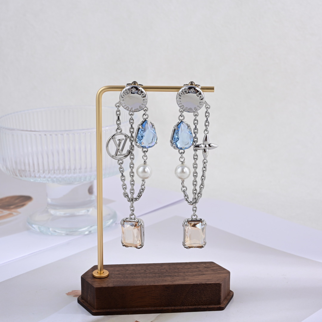 多位買家給出五星評價,表示實物質感優於預期。此款 LV 高仿女士耳環採用雙層銀色鏈條設計,主鏈鑲嵌水滴形藍晶與經典 LV Logo 圓牌,副鏈搭配圓潤珍珠與切割透明方晶,層次分明、行走間靈動閃耀。鍍層色澤持久不褪,耳桿為親膚防敏材質,長時間佩戴舒適不壓耳。適合日常通勤、聚會與正式場合,為造型增添優雅與辨識度。