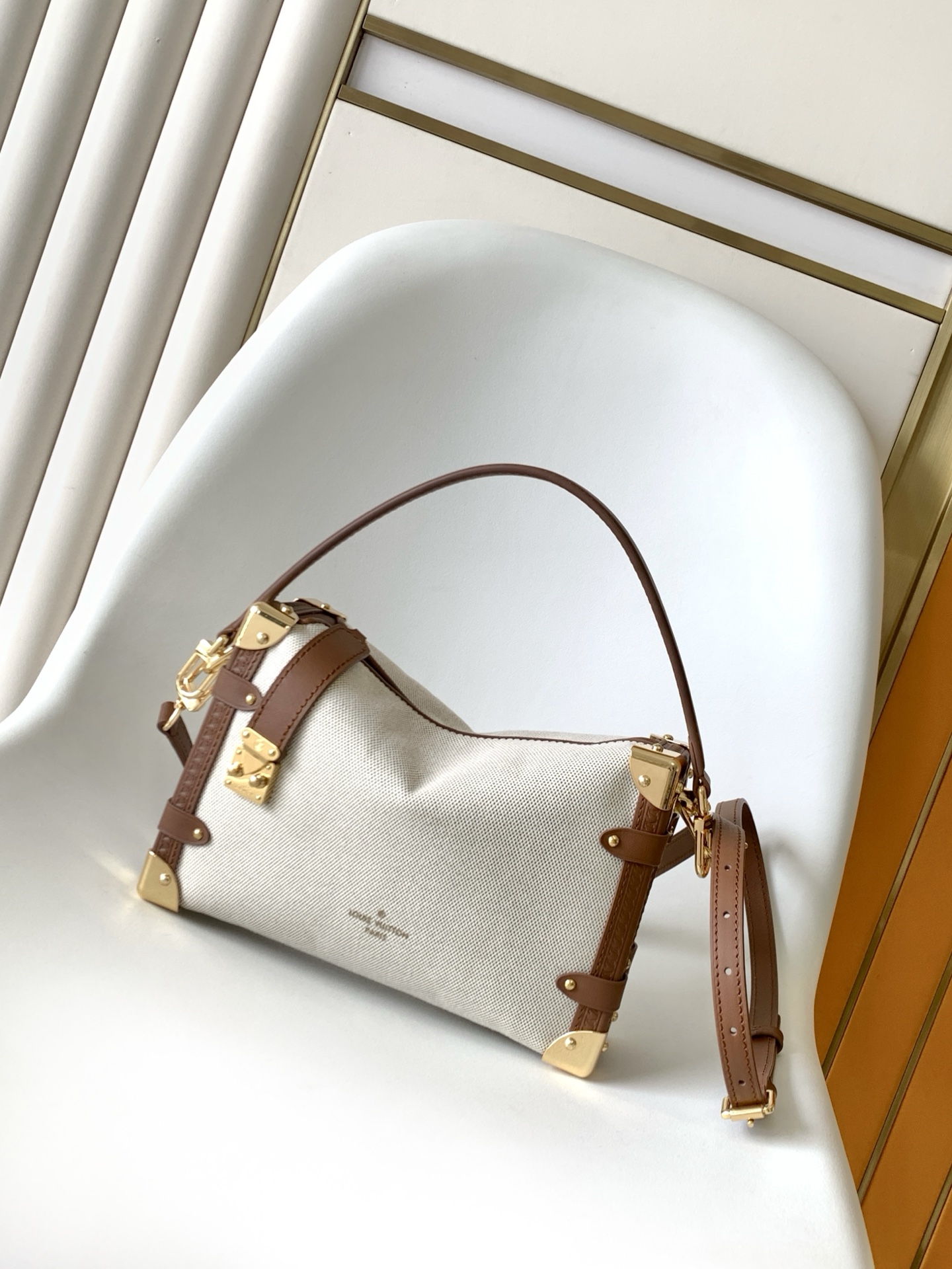 本商品採用高質感材質打造,細節考究、整體線條利落。這款LV高仿女款手提包以米白色帆布搭配棕色皮革飾條,並融合金屬角釘與鎖扣細節,呈現精品箱包風格的經典元素。包體比例修長俐落,實用又不失優雅氣息。配有可調式肩背帶與固定提把,手提與肩背皆宜,是日常與聚會皆適用的質感單品。此款兼具懷舊與現代風格,深受喜愛歐系設計風格者好評推薦。