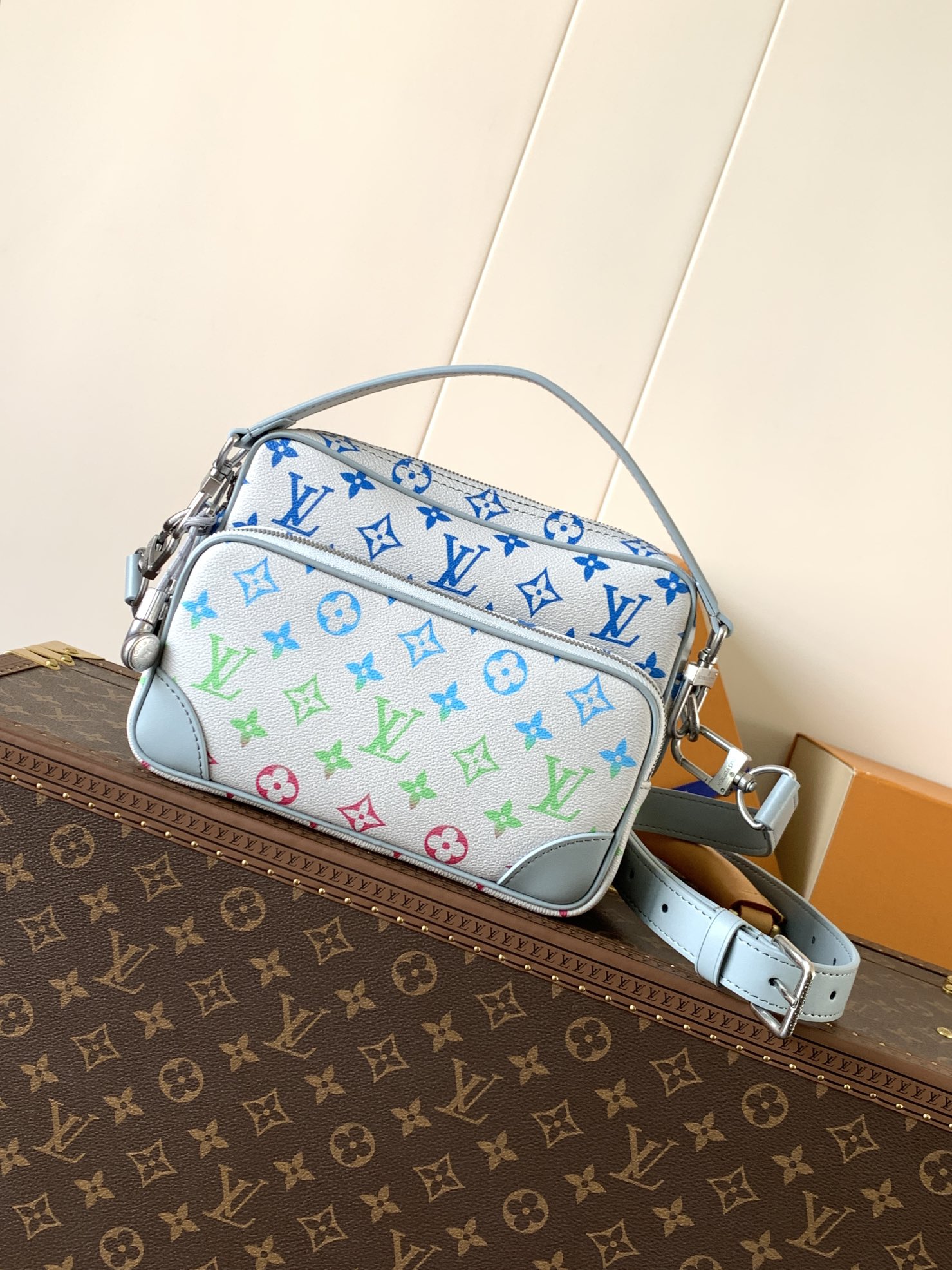 結合潮流元素與實用機能,是近期熱議話題款。這款LV高仿男款斜背包以水藍拼色與多色Monogram壓紋設計,跳脫經典黑灰風格,增添年輕感與活潑調性。包型採用雙層拉鍊結構設計,內部空間分類明確,搭配可調節肩背帶,適合日常外出、街頭穿搭、旅行休閒等多元場景,是個性男士的潮流之選。