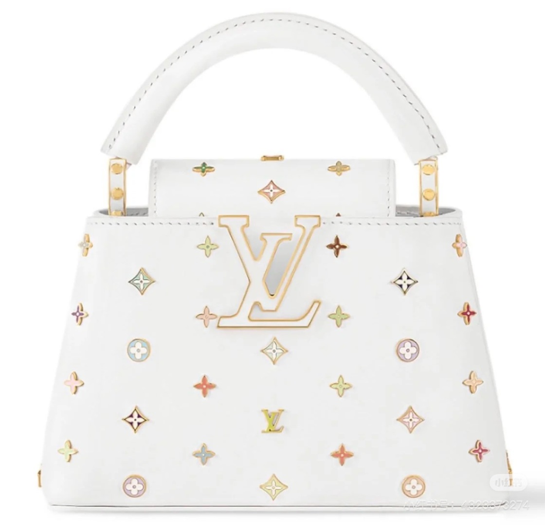 這款LV高仿Capucines Mini手提包選用白色進口牛皮製作,點綴多彩Monogram標誌與立體LV金屬Logo,展現柔美與華麗兼具的設計美感。小巧包型搭配俐落輪廓,內部容量充足,附可拆式肩背帶實用性佳。工藝與原版一致,五金色澤與縫線細節精準還原,日常或派對場合皆能輕鬆駕馭。