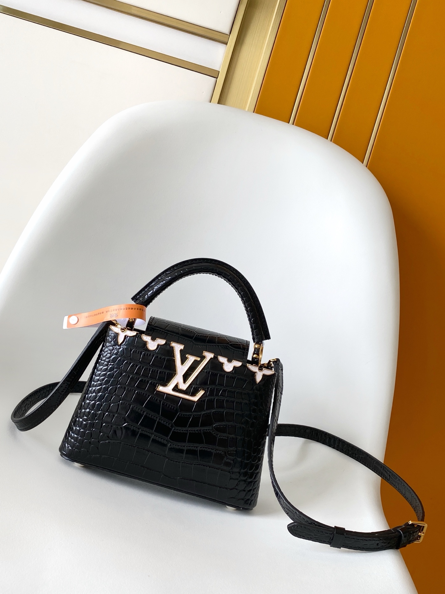 這款 LV 一比一 Capucines BB 手提包以黑色鱷魚壓紋皮革打造,搭配經典 LV 金屬標誌,展現高級奢華質感。包型小巧卻實用,內部分層合理,能輕鬆收納日常必需品。頂部手提設計搭配可拆卸肩帶,無論是正式場合還是休閒出行都能輕鬆駕馭。細節處的打磨與金屬光澤對標專櫃品質,讓人輕鬆展現優雅大氣的時尚品味。