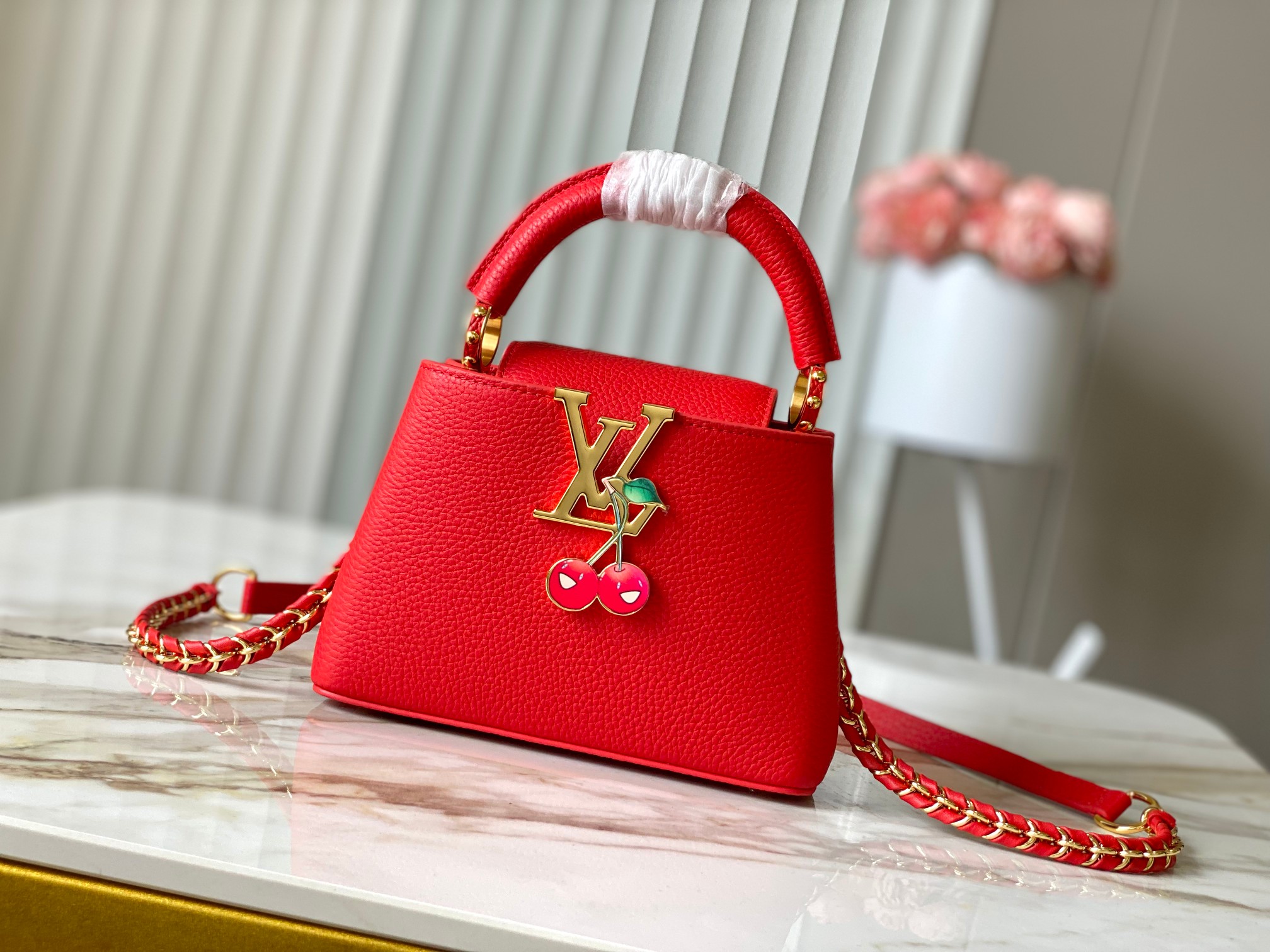 本商品採用高質感材質打造,細節考究、整體線條利落。這款LV原單Capucines紅色櫻桃女款手提包,以鮮豔紅色荔枝紋皮革搭配金色LV字母Logo與櫻桃裝飾,展現俏皮與高級兼具的氛圍。包身挺括有型,內部空間設計合理,能輕鬆容納日常隨身物品。消費者回饋「實物顏色更加亮眼,搭配後氣質立刻提升」,獲得極佳評價。金屬鏈條與皮革編織肩帶設計,增添精緻細節,是時尚女性不可錯過的精品選擇。