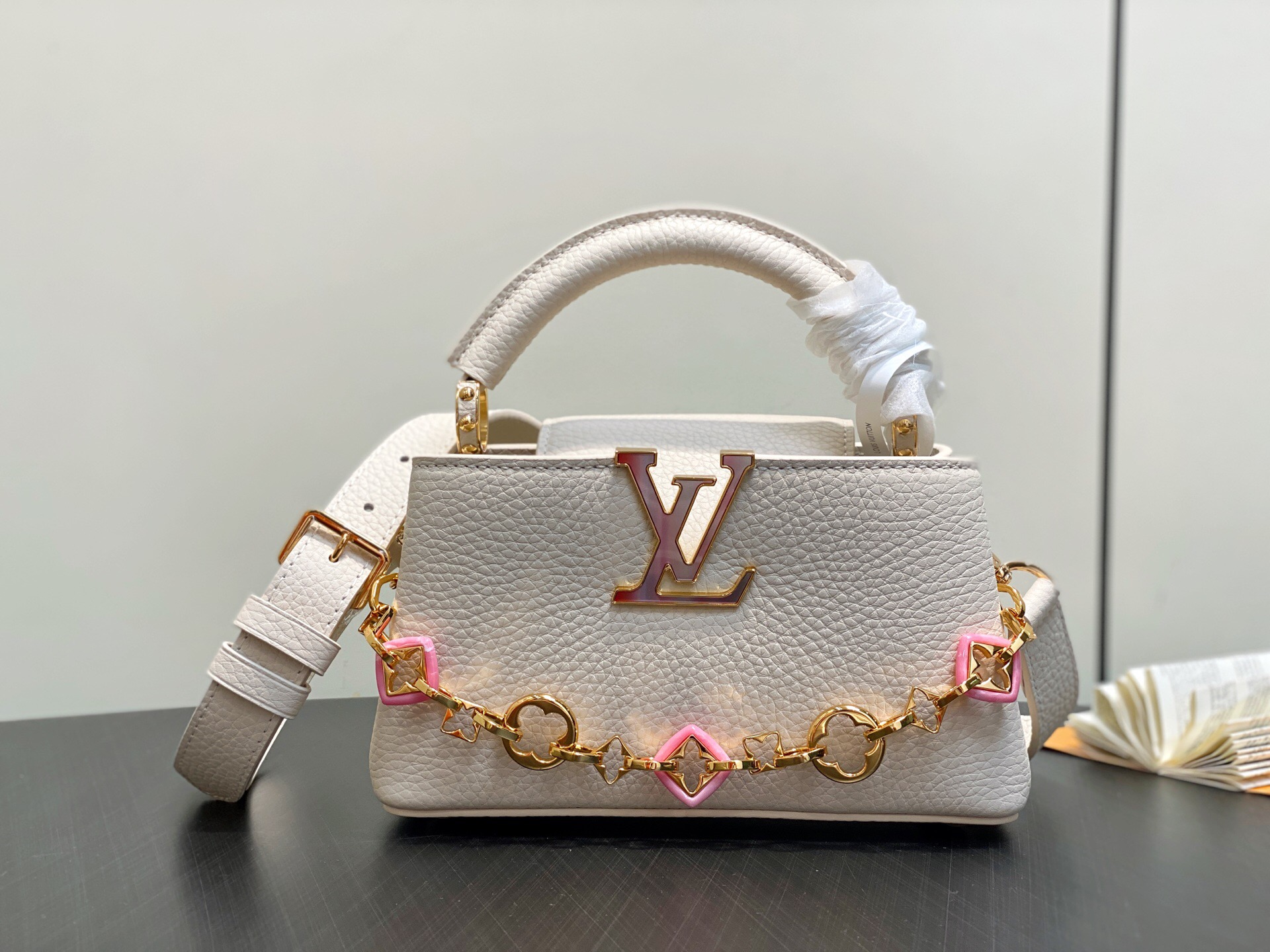精選來自人氣熱銷款式,搭配性極高,不論男女皆適合。這款LV精品仿製M14393 Capucines白色鏈條手提包,以細膩荔枝紋皮革打造,包身挺括有型。搭配金色Logo與粉色幾何鏈條裝飾,展現優雅中帶點俏皮的氛圍。肩背與手提皆宜,實用性與百搭性兼具。消費者回饋「實物比照片更驚艷,鏈條細節極具少女感,質感媲美專櫃」,獲得一致好評。內部空間合理,能輕鬆收納日常用品,是時尚女性必備的精品仿製單品。