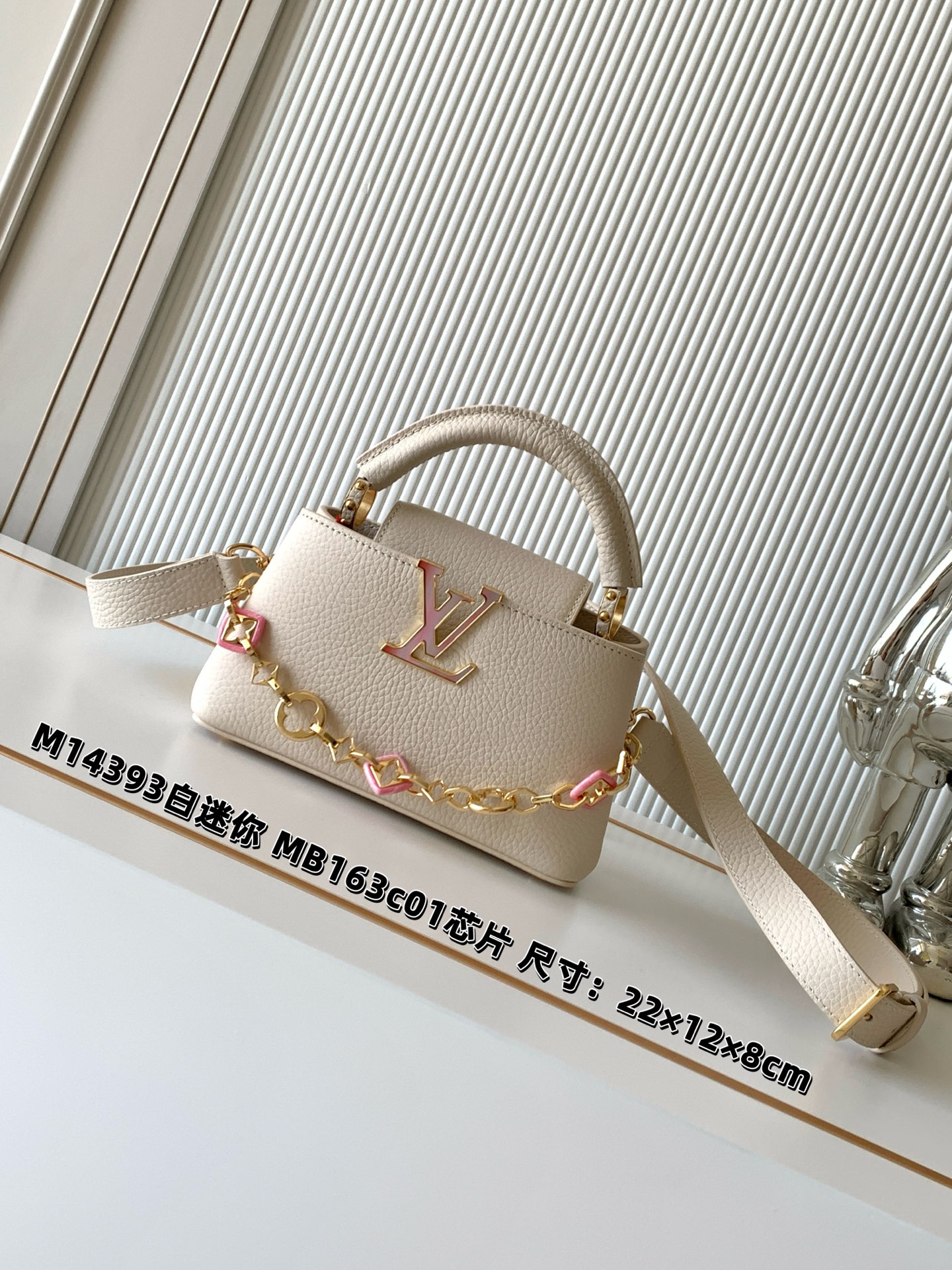 這款 LV 一比一 白色手提包,以細緻荔枝紋牛皮打造,結合俐落包型與金屬鏈條點綴,展現優雅高級質感。小巧尺寸設計(22×12×8cm),可手提、肩背或斜挎,靈活搭配各種穿搭風格。精緻五金與立體 LV 標誌提升辨識度,整體質感對標專櫃,輕鬆成為日常出街與約會的百搭首選。
