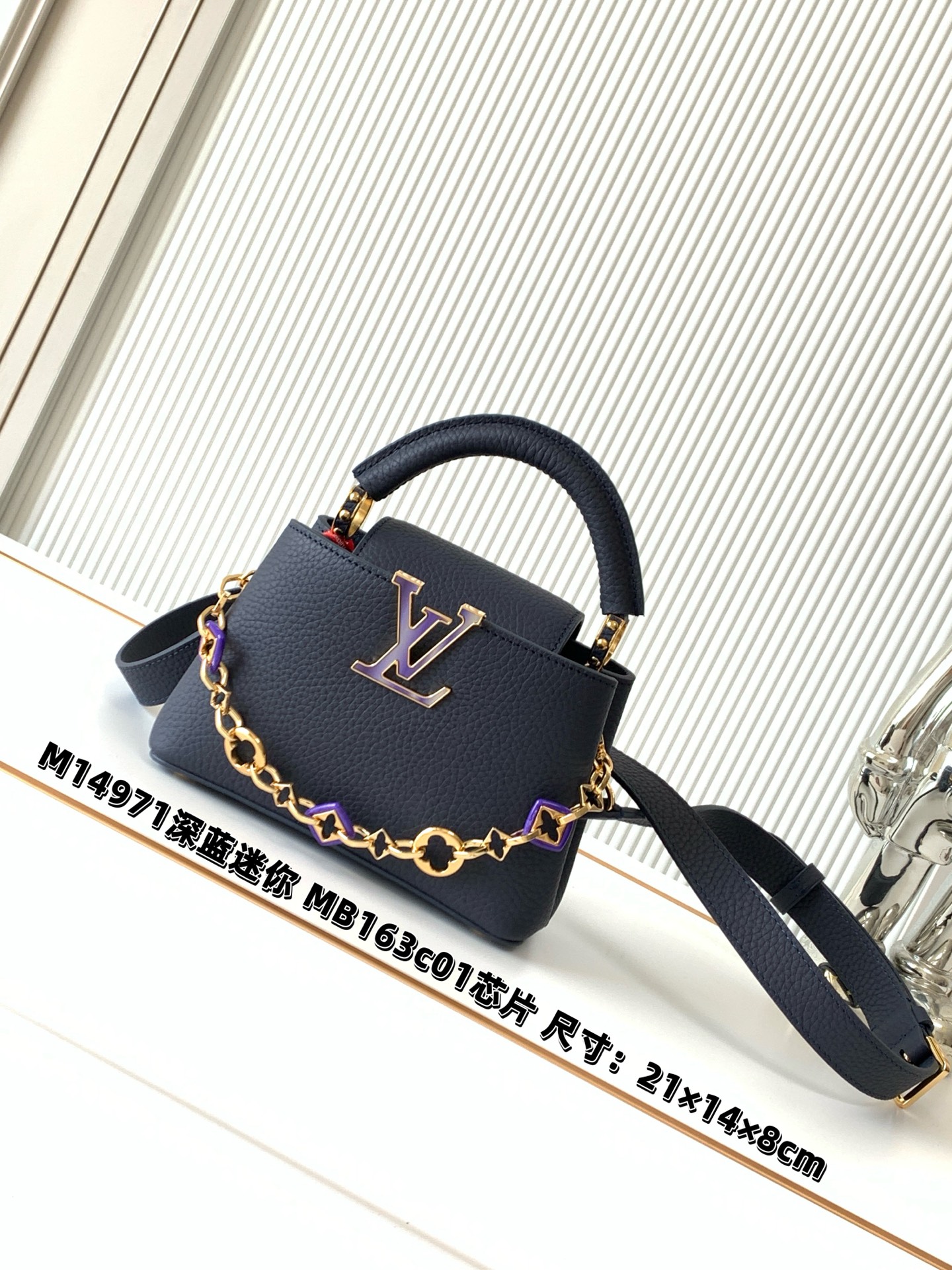 這款 LV 原單 深藍色手提包,以荔枝紋牛皮製作,質感細膩,低調卻奢華。金屬鏈條結合紫色點綴,增添時尚層次,包身尺寸為 21×14×8cm,輕巧實用,適合日常出行與正式場合。立體 LV 標誌與高質感五金對標專櫃,搭配可調節肩帶,提供手提、單肩、斜挎多種方式。