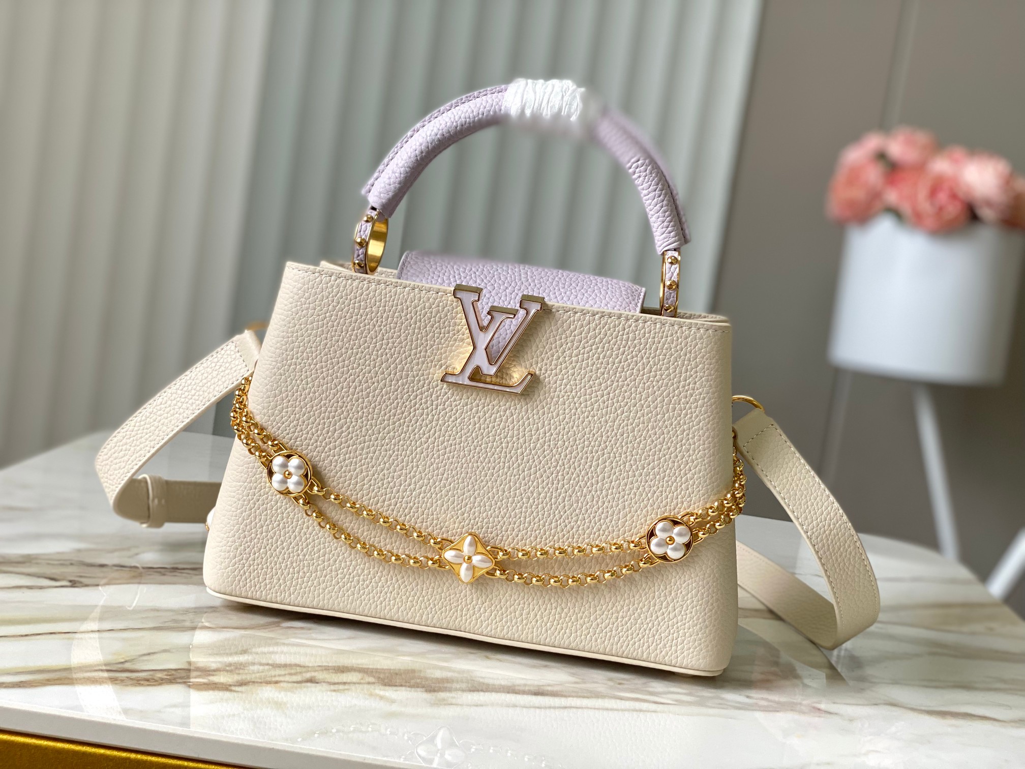 這款 LV 高仿奶油白金鏈花飾手提包(中號版),以細膩荔枝紋小牛皮打造,質感柔軟而堅挺,觸感細緻。包身挺括大方,搭配金屬 LV Logo 與珍珠花飾鏈條,細節設計精緻優雅。中號尺寸更實用,能輕鬆收納長夾、化妝品、手機等日常用品,無論工作或聚會都能兼顧時尚與實用。肩背、斜挎或手提皆宜,深受用家好評,堪稱百搭精品仿製之選。