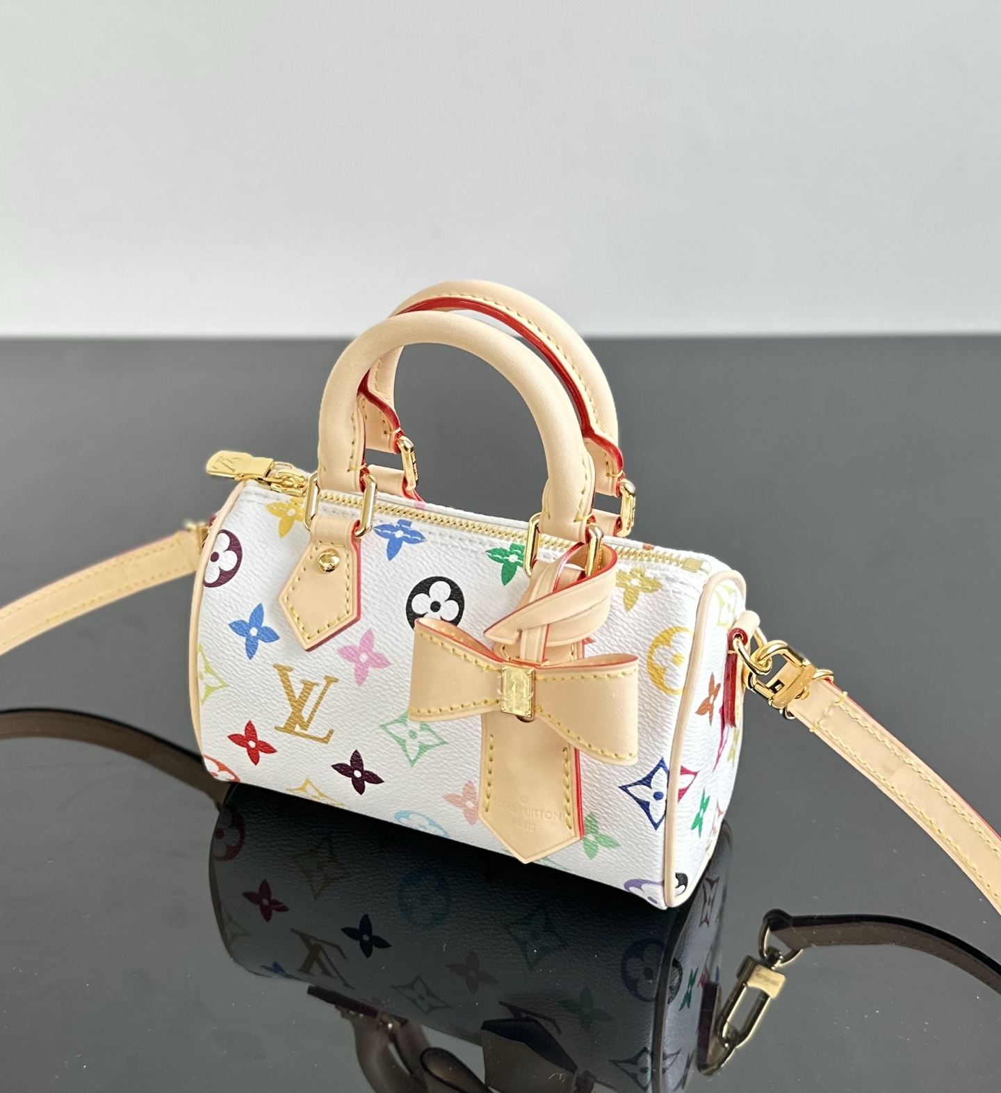 本頁精選來自LV經典Multicolor系列的白底Nano Speedy迷你包款,採用Monogram彩色印花圖騰結合可愛蝴蝶結吊飾,展現甜美又復古的風格。這款LV高仿手袋完整還原正品比例與細節,從帆布光澤、五金扣件到自然色小牛皮提把,每一處皆仿真度極高。根據顧客回饋,外出攜帶時經常被誤認為收藏級正品,更有買家表示比真品更實用。作為【一比一精品包包】入門選,既具辨識度又不失少女感。