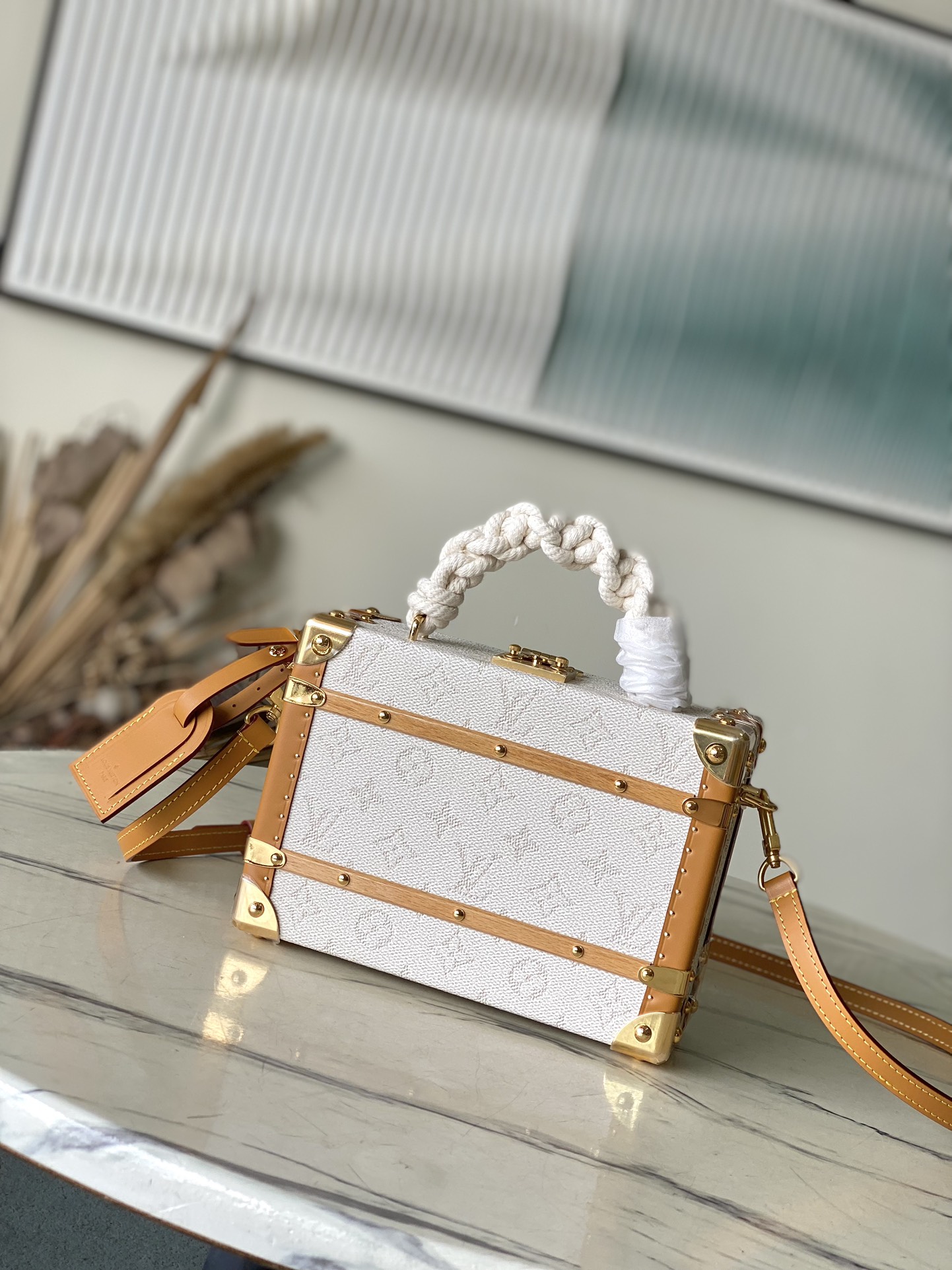 根據客人回饋,這款LV M14440原單Petite Malle箱型小包,擁有正品外觀、售價親民,精緻黃皮包邊與米白Monogram帆布,復古風格十足。編繩手柄設計柔中帶剛,手持與肩背皆宜,細節如鉚釘、鎖扣均對標原廠工藝,收藏與實用兼具,是香港仿牌精品袋款中高人氣選擇,適合追求特色時尚的品味人士。