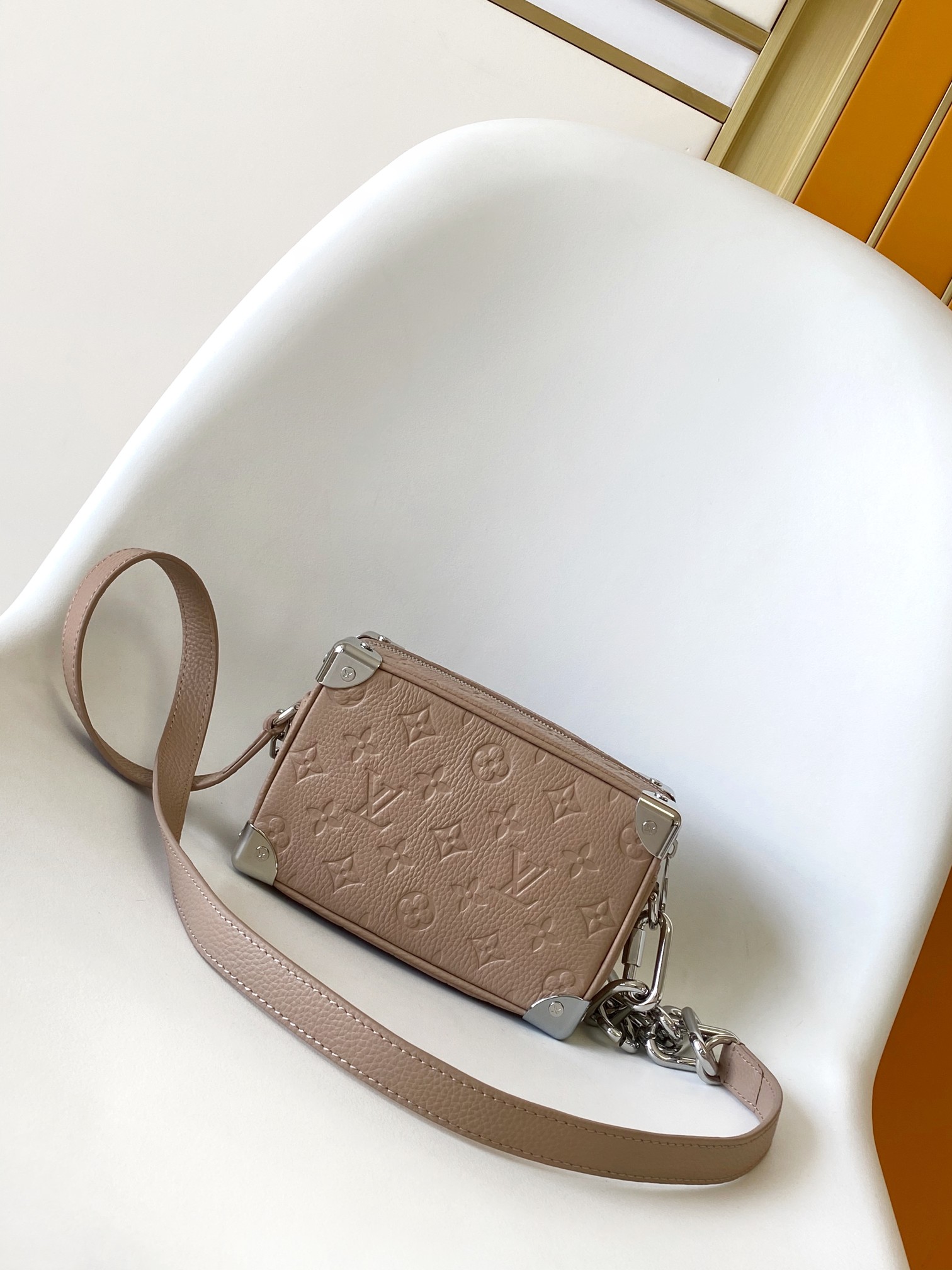 根據客人回饋,這款LV原單Mini Soft Trunk手提包以粉嫩杏色搭配壓紋Monogram呈現清新高級質感,箱型設計與銀色五金角釘完美融合,外型小巧卻極具氣場。採用進口荔枝紋牛皮製成,手感柔軟,搭配金屬鏈條與寬版肩帶,背負舒適又具設計感。實測容量足以放入手機與卡夾,適合約會或聚餐使用。原單等級製作,整體細節對標正品,已成為近期詢問度極高的熱賣款。