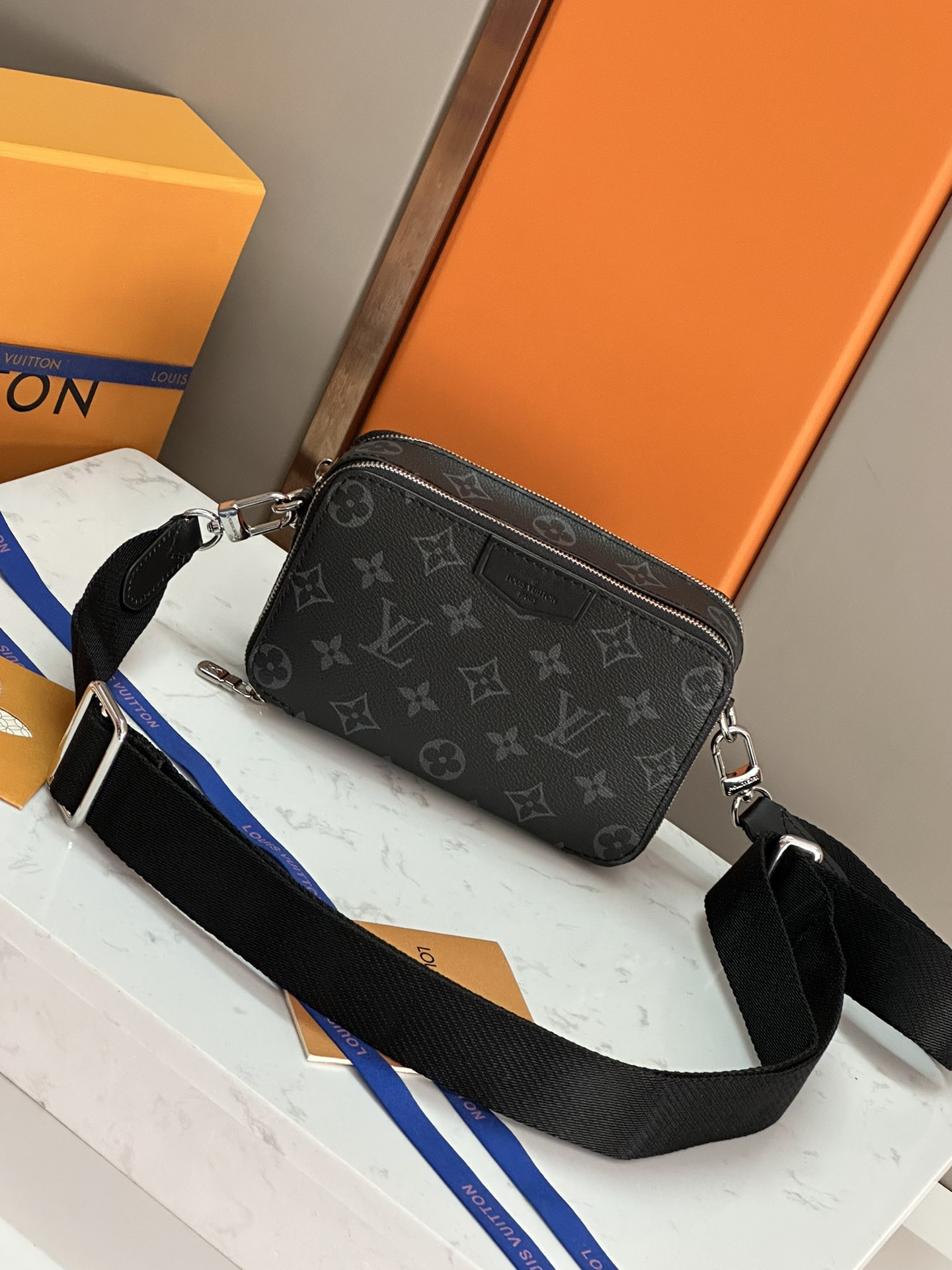 這款LV A貨黑色斜背包選用經典Monogram Eclipse帆布製作,低調中展現時尚氣場。雙層拉鍊設計讓內部分隔更加清晰,方便收納手機、錢包、卡片與鑰匙等日常隨身小物。包身輪廓挺拔,搭配寬版帆布肩帶,實背感舒適不勒肩,適合日常通勤、假日出行等多種場合。此A貨版本在皮面壓紋、車縫與配件質感方面與正品極度相近,推薦給追求實用性與高級外觀的型男選擇。