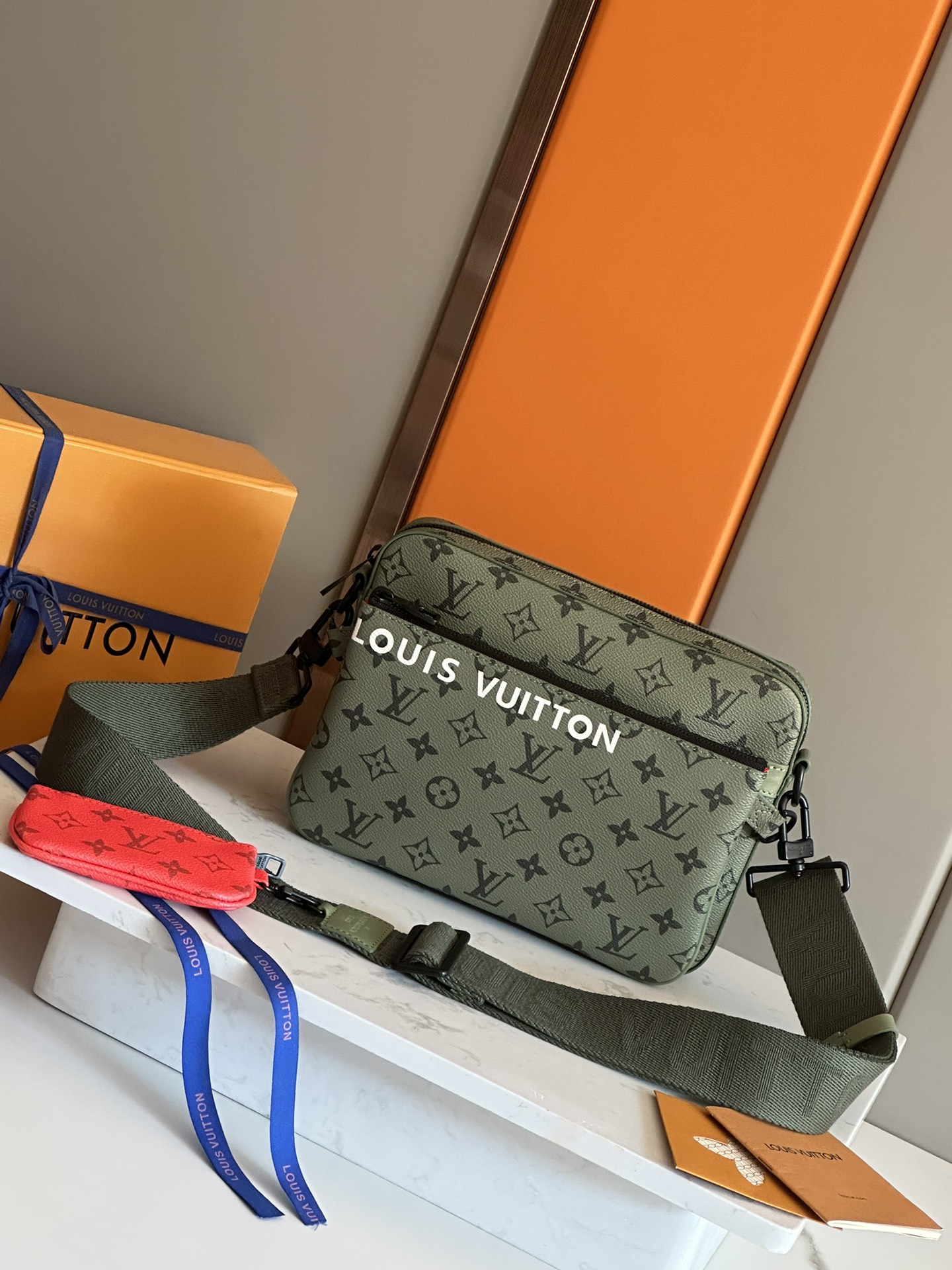 這款LV斜背包以墨綠色 Monogram 帆布呈現濃厚軍風氣息,選用一比一對版材質製作,無論字體印刷或皮革紋理皆高度還原。前側印有LOUIS VUITTON標誌性字樣,搭配紅色拉鍊夾層細節,增添一抹跳色亮點。包款設計靈感來自經典郵差包,尺寸適中,配有大開口與實用夾層,能輕鬆收納手機、錢包與配件等日用品。尼龍肩帶寬厚舒適,兼具斜背與側背功能,多位顧客回饋此款穿搭自由度高,適合日常通勤與街頭穿搭使用,為男士推薦首選之一。