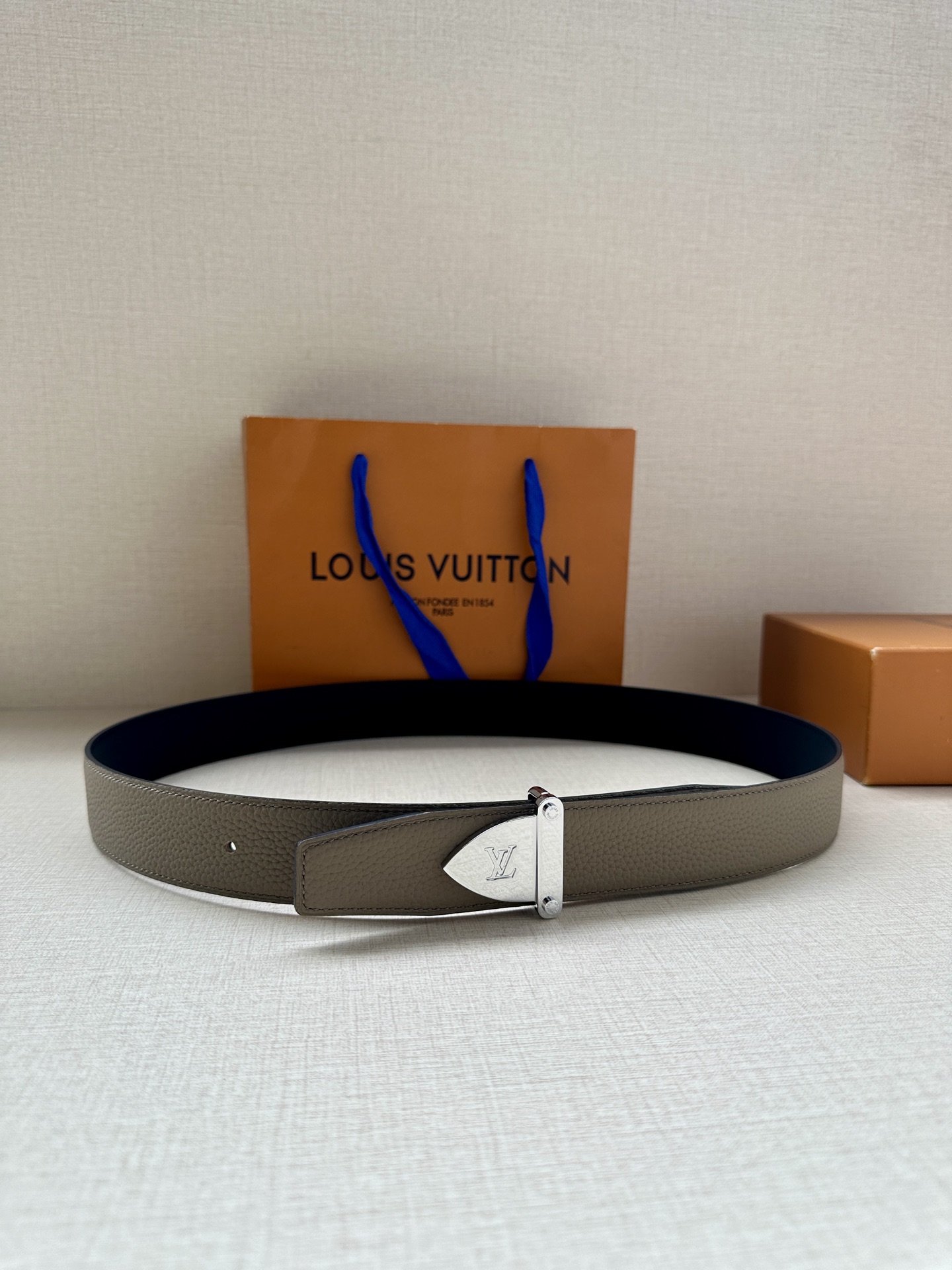 這款 LV 高仿男士皮帶採用進口牛皮壓紋工藝,呈現質感細膩的灰棕色調,搭配經典銀色 LV 金屬扣頭,低調中散發優雅。帶身挺括不易變形,無論搭配正裝西服或休閒牛仔都能展現品位。實際佩戴舒適度佳,細節對標原版,深受買家好評。