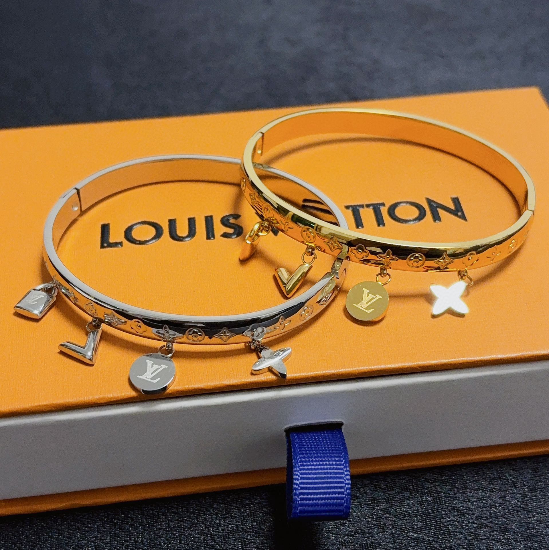 這款LV原單仿製黃金色手鐲,以品牌經典Monogram壓紋為基底,搭配精緻的LV字母、圓牌與星形吊飾,為整體設計增添靈動奢華感。黃金色金屬表面光澤亮麗,質感細膩,透出品牌一貫的高級風格。活動吊墜在手腕間隨步伐輕盈搖曳,為佩戴者帶來俏皮與優雅兼具的氛圍。無論搭配休閒服飾還是晚宴禮服,都能完美展現精緻品味與時尚格調。