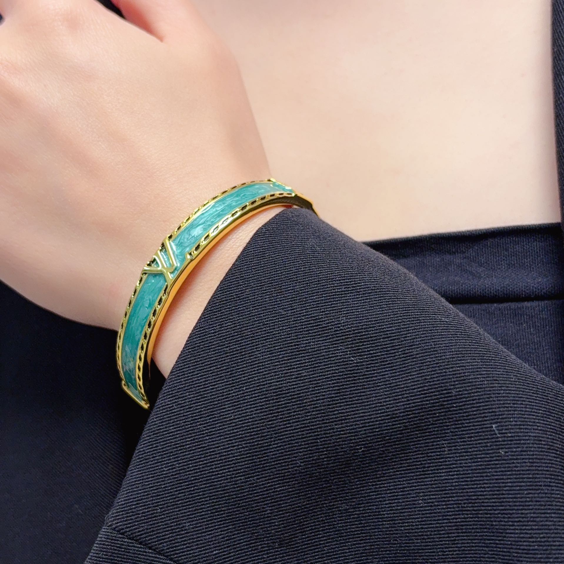 為您推薦最新一季潮流單品,設計時尚、實用性高。這款LV一比一女士手環以品牌經典「LV」字樣為亮點,結合金色邊框與綠色琺瑯裝飾,低調中展現高貴氣質。精緻工藝確保細節無可挑剔,配戴時舒適不刮手,適合日常與正式場合。客人回饋表示,此款LV一比一手環不僅質感優異,光澤度與專櫃款極為相似,實物上手更顯優雅,特別受女性上班族喜愛。細膩的金邊雕刻與琺瑯紋理,讓整體造型更顯精緻,是近期備受矚目的飾品之一。