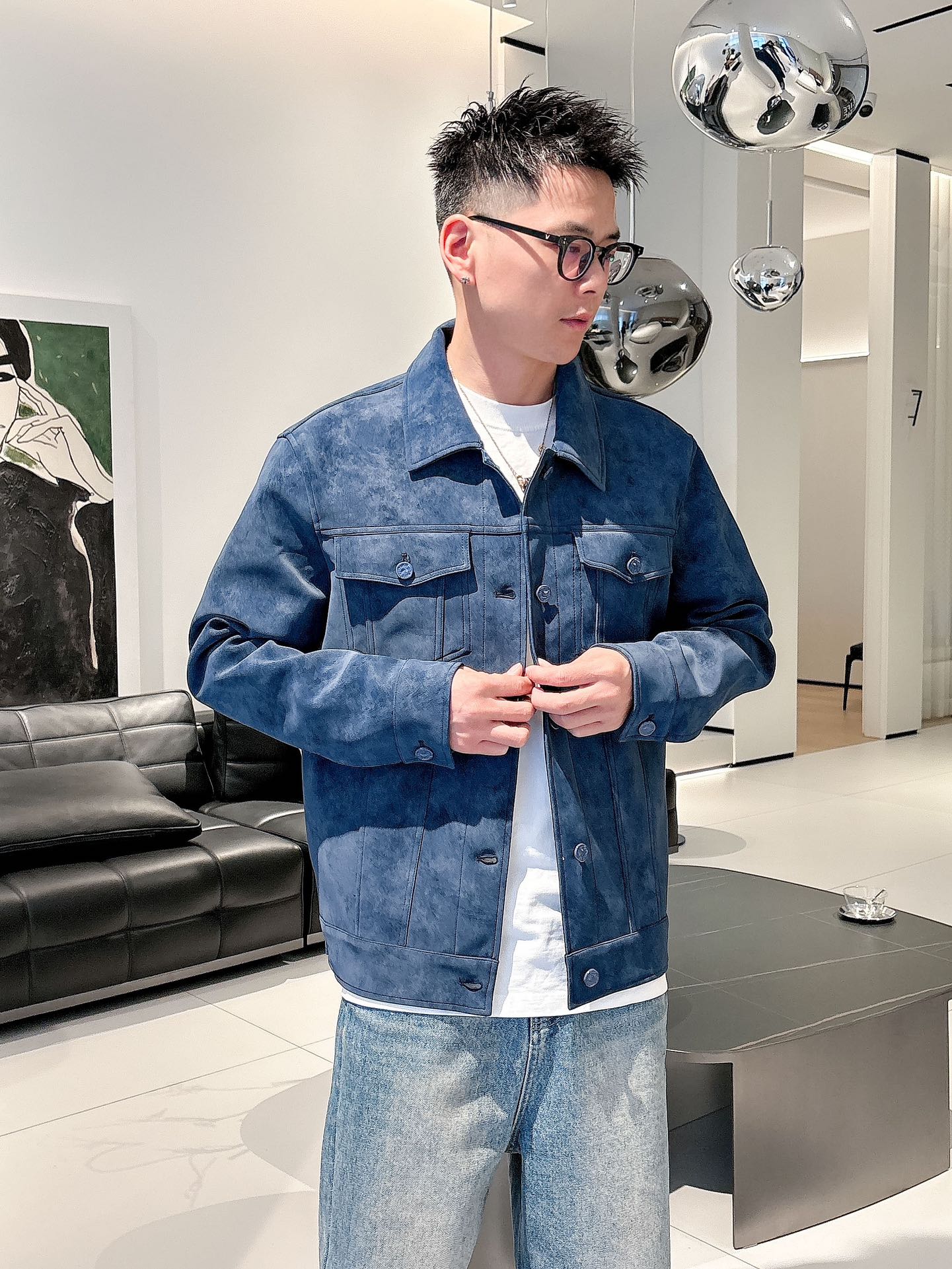 這款 LV 高仿深藍麂皮感牛仔外套,質地柔韌帶有細膩的磨砂感,上身效果更顯挺拔與質感。經典翻領搭配直排扣設計,胸前雙口袋細節保留品牌實穿風格。深藍色調沉穩百搭,無論配白色 T-shirt 或牛仔褲都能展現出清爽俐落的氣質。適合日常出行、休閒場合,低調卻有型。