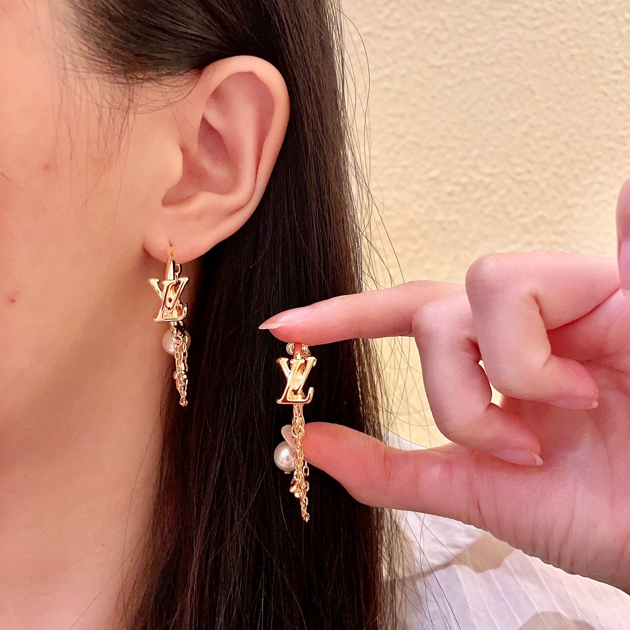 這款LV原單耳環採用金色經典「LV」字母標誌作為設計核心,搭配柔和光澤的珍珠與細緻金色鏈條,營造出高雅而靈動的垂墜效果。珍珠的圓潤與金屬光澤相互呼應,提升佩戴者的氣質與魅力。無論是搭配正裝出席宴會,還是日常穿搭,都能展現專櫃級的精緻細節與奢華質感。