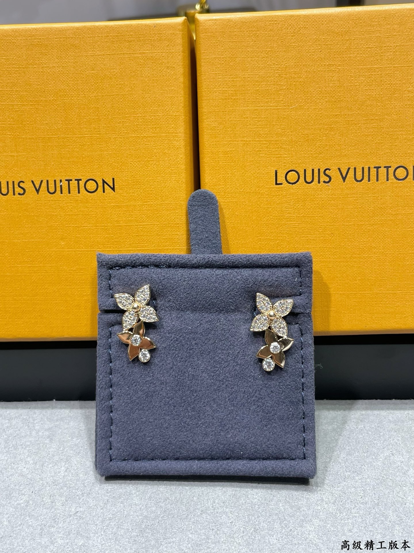 此款LVA貨仿製耳環,採用雙層花朵設計,上層為經典Monogram四瓣花朵鑲滿亮鑽,光彩奪目;下層為金色金屬線條勾勒的花瓣,中心及底部鑲有單顆晶鑽,垂墜設計增添靈動感。佩戴後能修飾臉型,散發優雅高貴氣質,適合日常佩戴及出席宴會場合。