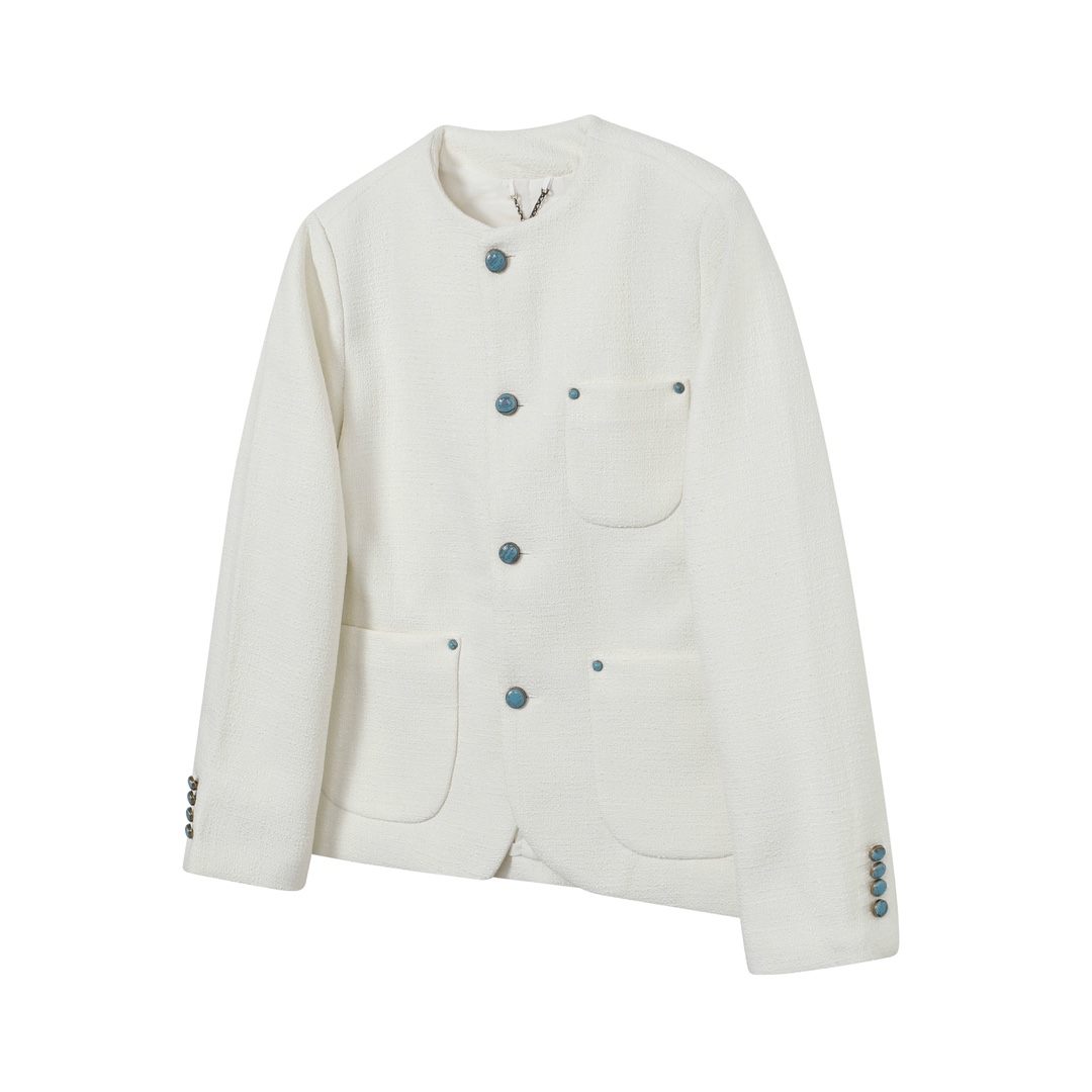 原創輪廓設計,搭配簡潔造型,展現俐落高級感。這款LV高仿男款圓領西裝外套選用溫潤奶油白色布料,搭配藍色金屬飾釦與三口袋配置,風格介於優雅與日常之間。圓領剪裁打破傳統西裝框架,更顯現代紳士質感。布料細緻輕盈,內裏滑順不悶熱,無論搭配T恤或高領毛衣都能展現高階品味。此款特別適合輕正裝、休閒混搭等場合,是一款造型完整度極高的精品仿製推薦款。