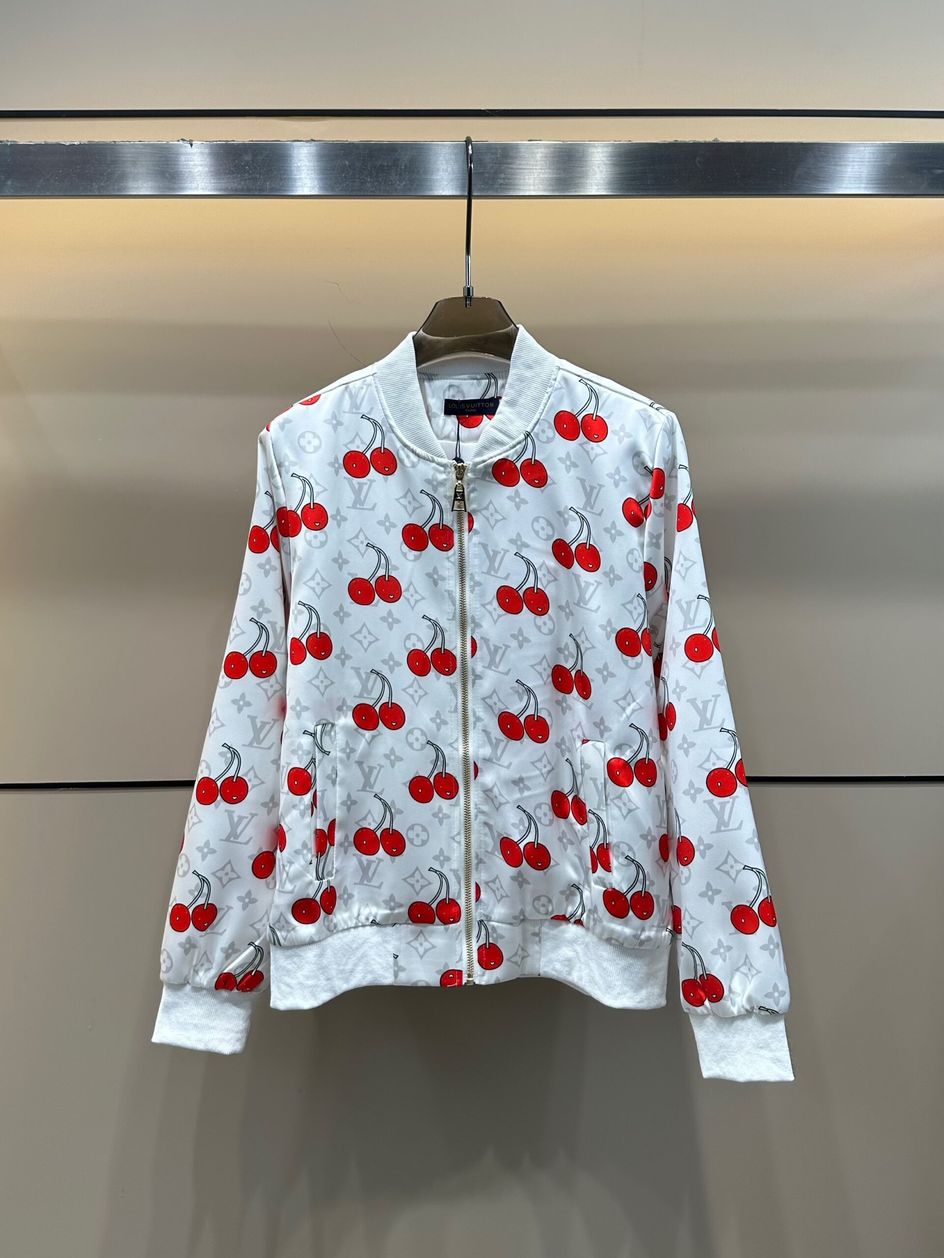 這款 LV 一比一櫻桃印花外套,以白色基底搭配經典 Monogram 背景,並點綴亮眼紅色櫻桃圖案,俏皮又不失時尚感。前拉鍊設計搭配實用口袋,版型利落,穿著輕盈舒適。採用高品質布料製作,做工細緻對標專櫃,保證上身效果自然挺括。顧客反饋「櫻桃印花讓人一眼驚艷,出街穿搭很有亮點」,是春夏出遊或日常休閒的必備單品。