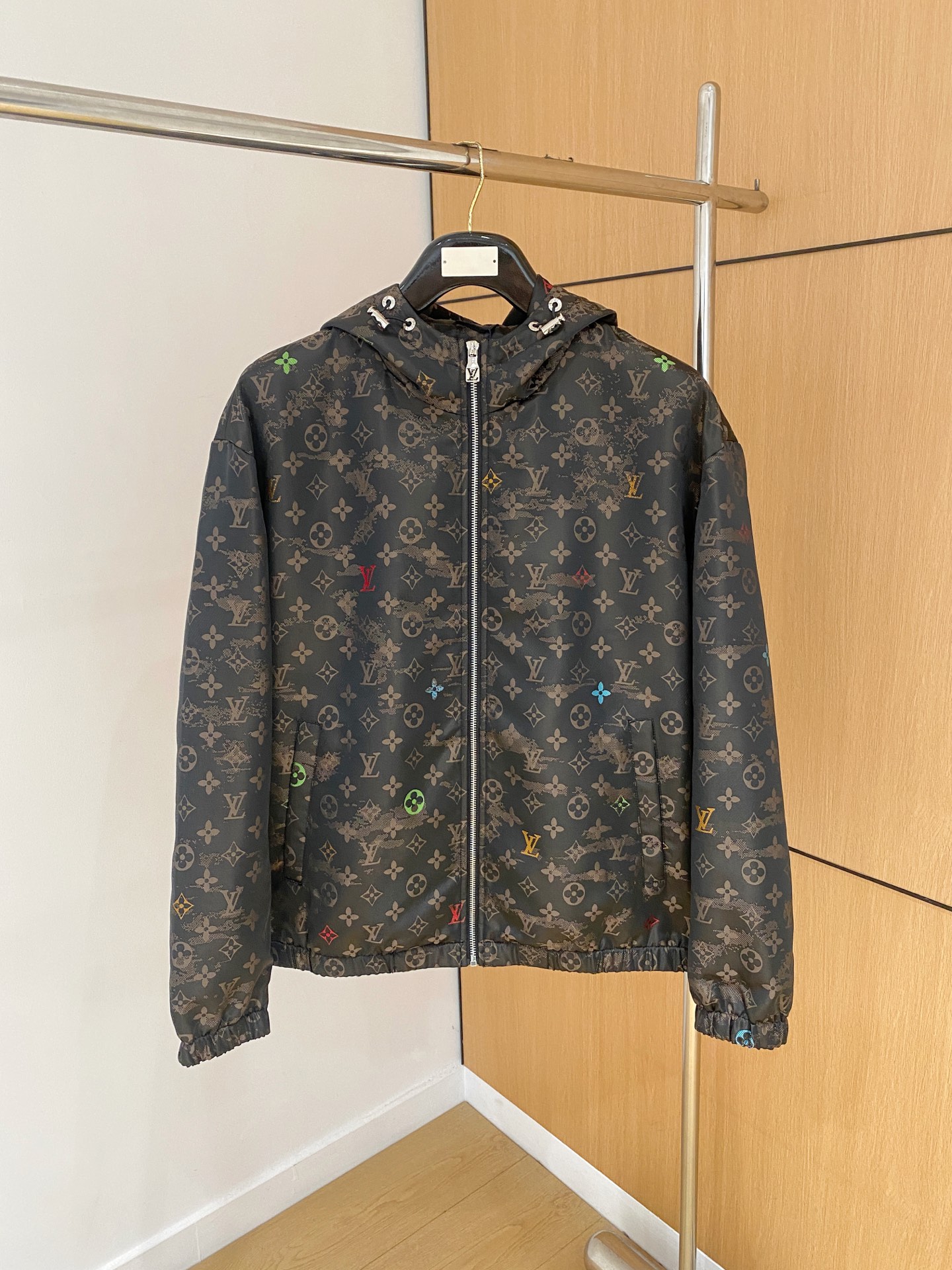 這款 LV 原單連帽外套 採用防風防潑水材質,黑色基底搭配滿版 Monogram 與彩色 LV 標誌,讓經典圖案更添活力。拉鍊門襟與抽繩設計實用性高,袖口與下擺鬆緊細節提升穿著舒適度。多位買家回饋指出,實際上身效果年輕時尚,適合日常出街或旅行搭配,輕鬆展現高級潮流感。