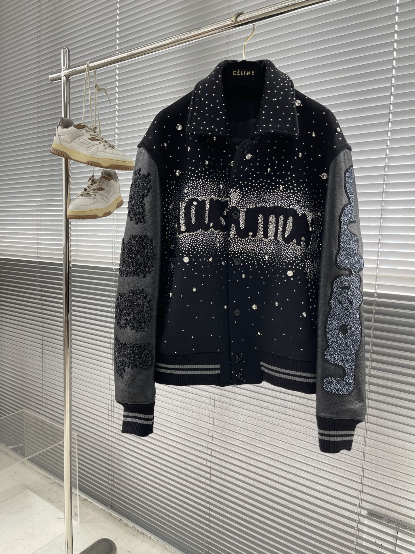 這款LV高仿棒球外套將街頭元素與奢華質感完美融合,外型極具辨識度。整體以黑灰色調為主,採用高質感毛呢與皮革拼接製成,肩袖部分拼接灰黑皮革,打造立體結構與視覺層次。滿版施華洛風格鑽飾與LV經典元素刺繡,讓整體風格搶眼又不失品味。胸前大面積品牌標語設計,雙袖左右各有立體拼布裝飾,細節到位。下擺與袖口採條紋羅紋收口設計,增添運動風格與保暖功能。適合搭配牛仔褲與潮鞋,輕鬆打造高街穿搭。