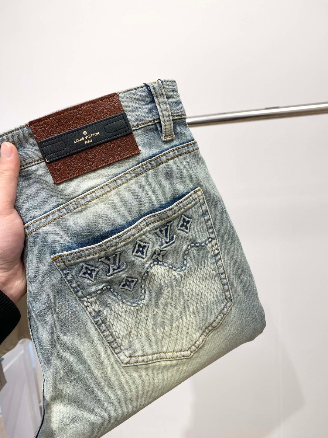 這款LV高仿男士牛仔褲以復古水洗藍為基底,搭配後口袋獨家老花刺繡與白色漸層洗舊印花,營造層次豐富的視覺效果。牛仔面料挺括柔軟,穿著舒適透氣,適合台灣春夏季節。背面皮標採用品牌經典壓紋拼接設計,細節質感再升級。剪裁合身修飾腿型,可輕鬆搭配球鞋、T恤或外套,無論休閒或街頭風格都能完美駕馭,是型男衣櫃中不可或缺的百搭單品。