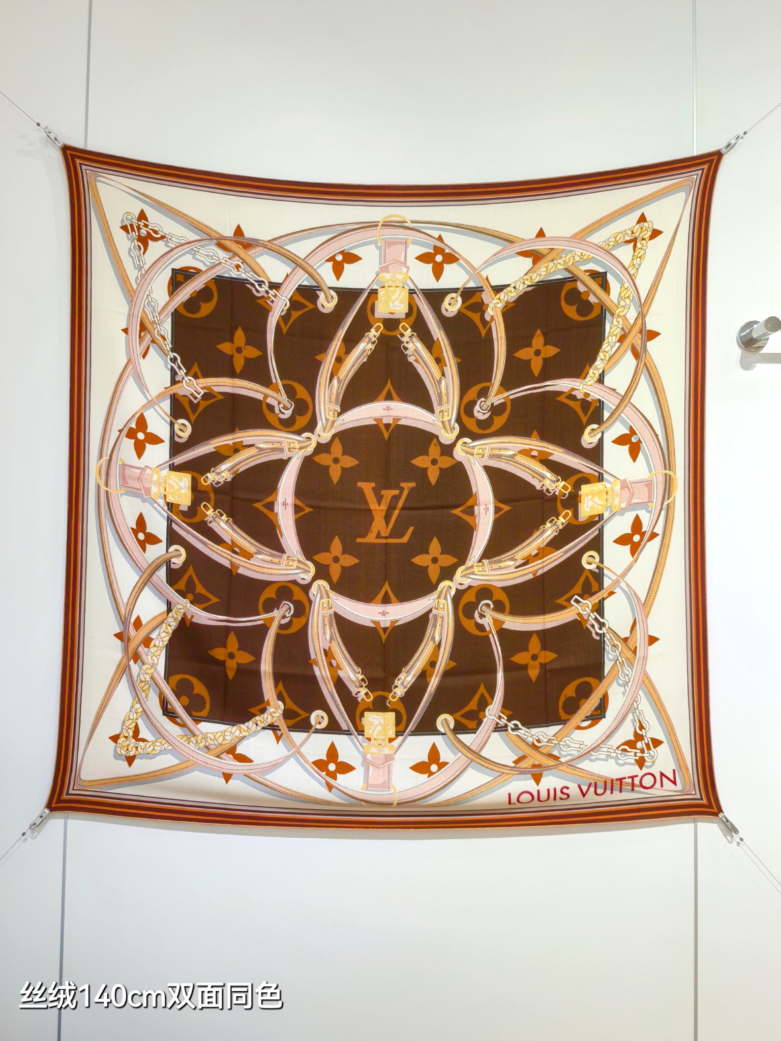這款LV高仿絲巾選用140CM大尺寸,採用品牌經典Monogram搭配鎖鏈與皮帶元素圖騰,整體設計層次感強烈。細膩絲質觸感輕盈順滑,佩戴舒適,無論是披肩、頸巾或包包點綴都能展現時尚格調。棕色與米色的經典對比,讓整體造型更顯大方雅緻,深受潮流人士與收藏愛好者喜愛。