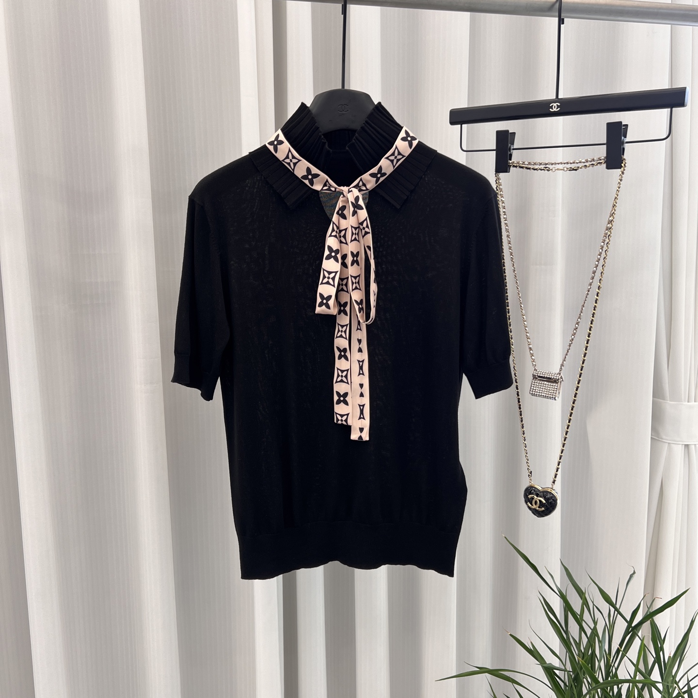 這款 LV 高仿 女士短袖針織衫,以簡約俐落的黑色為主調,搭配領口粉色 Monogram 綁帶點綴,瞬間提升時尚感。柔軟針織材質親膚舒適,短袖設計適合春夏穿搭,無論單穿或搭配外套都能展現高級質感。細節處理精緻,領口摺疊工藝與綁帶設計結合,凸顯女性優雅與率性。買家回饋:「實物很驚喜,做工講究,綁帶細節非常加分!」這款 LV 高仿 短袖針織衫,是日常通勤與聚會的百搭單品。