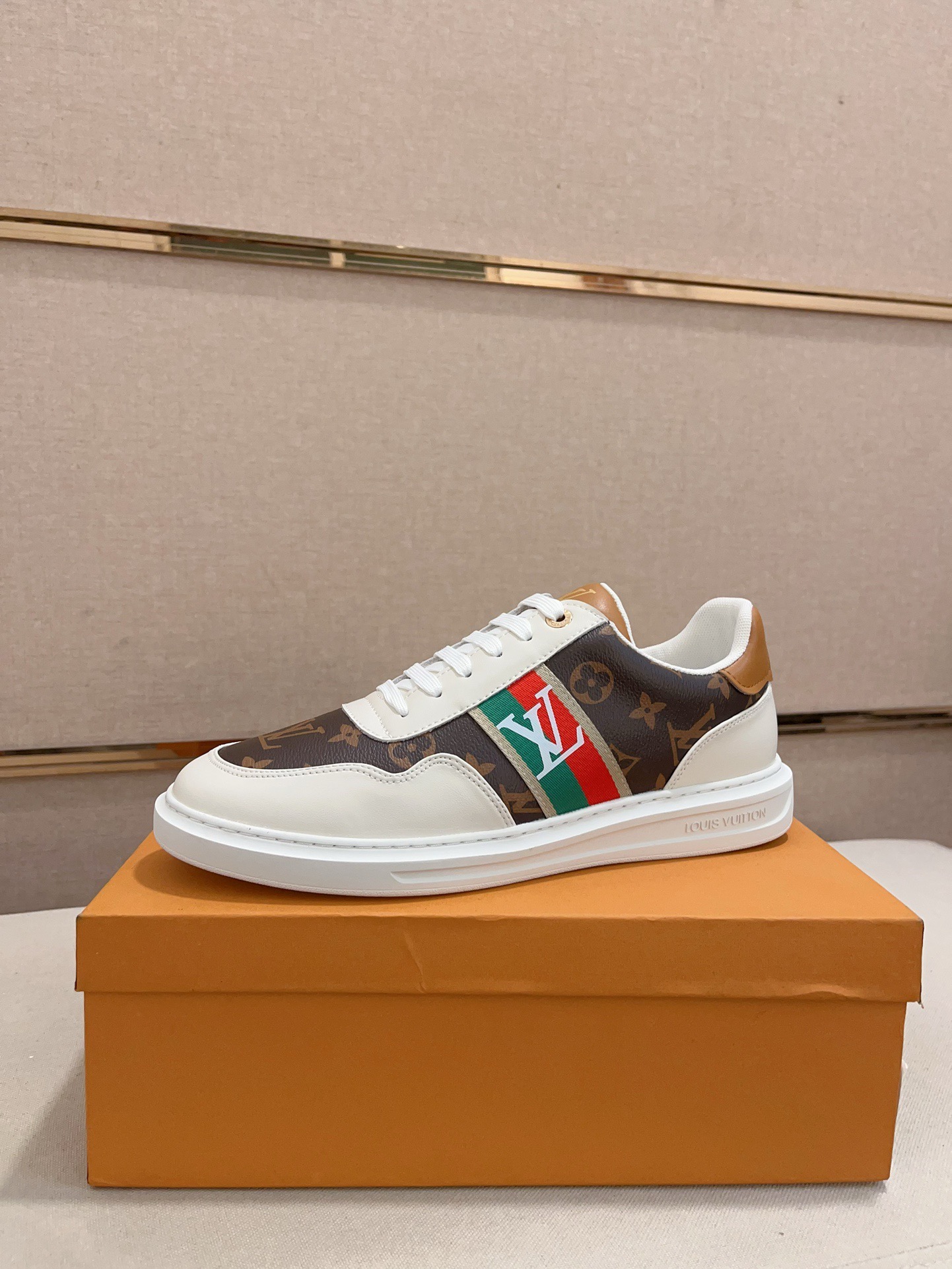這雙 LV 精品仿製 Monogram 拼接休閒鞋,採用經典棕色老花帆布與白色牛皮革拼接,鞋側的紅綠條紋加上醒目的 LV 標誌,充滿品牌辨識度。鞋底設計輕盈耐磨,提供舒適的日常穿著體驗。消費者評價指出此鞋百搭實用,無論搭配牛仔褲或休閒西裝,都能展現俐落時尚感。細節處的對標製作,將高端休閒感與實穿功能完美結合。