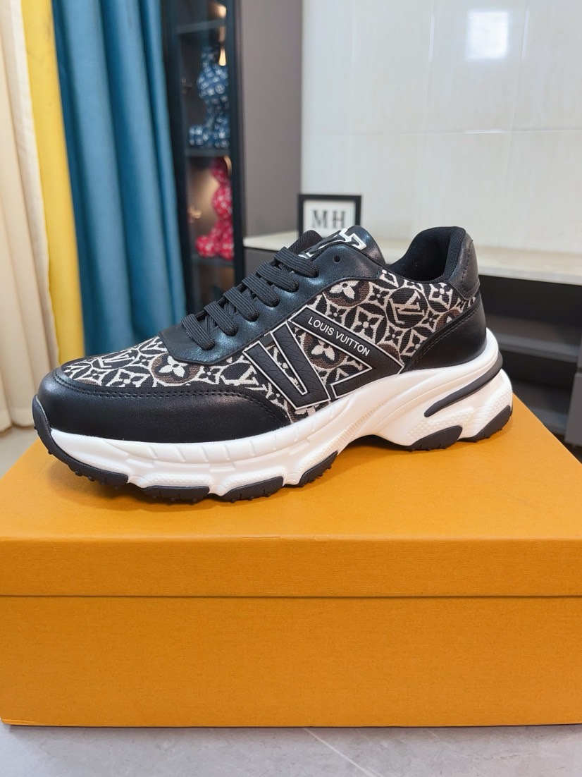 這雙 LV 高仿 黑色運動鞋,以經典 Monogram 花紋布料搭配黑色皮革,呈現大氣沉穩的時尚格調。鞋底採用厚底設計,兼具緩震與舒適感,適合長時間穿著。鞋面花紋細節清晰,縫線與拼接精緻,對標原版質感。無論是日常街頭穿搭還是運動休閒,都能展現品牌經典風範。