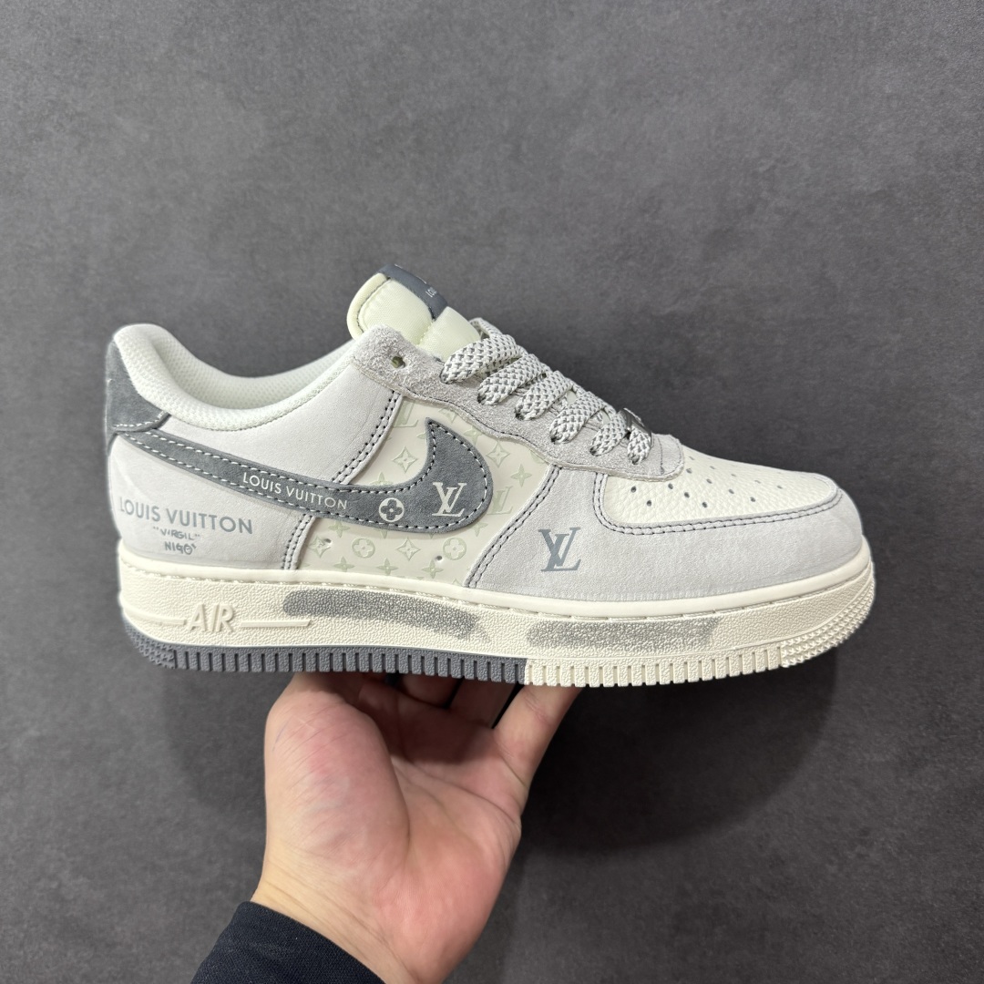 這雙 LV 原單 灰白拼接低幫運動鞋,延續經典 Air Force 輪廓,鞋面以灰白色調結合 Monogram 壓紋與皮革拼接,整體視覺層次感鮮明。鞋側 LV 標誌與 Swoosh 上的印花細節,凸顯獨特設計語言。鞋墊柔軟舒適,橡膠大底耐磨防滑,適合日常街頭與休閒穿搭。以低調灰白色系展現質感,實用又時尚。
