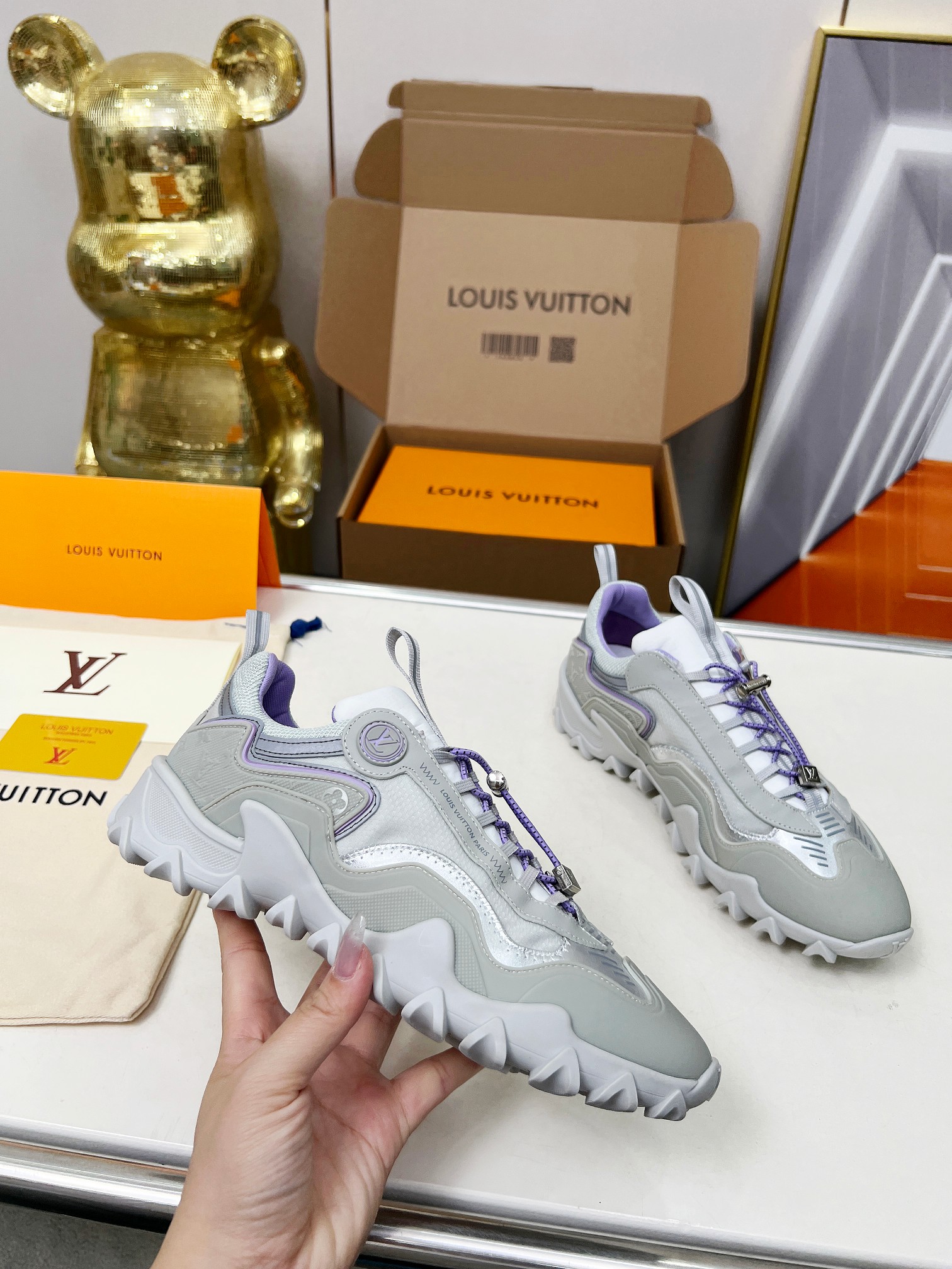 這款 LV 一比一 灰紫運動鞋以獨特的灰色與紫色拼接設計,帶來清新又時尚的視覺感受。鞋面使用合成皮革與網布材質,兼具耐磨與透氣效果。鞋帶以紫色細節點綴,搭配金屬扣件,增添質感與功能性。厚底齒狀鞋底設計,不僅增強抓地力,還能提升穿著的穩定性。無論是日常出街還是休閒穿搭,都能輕鬆打造個性風格。