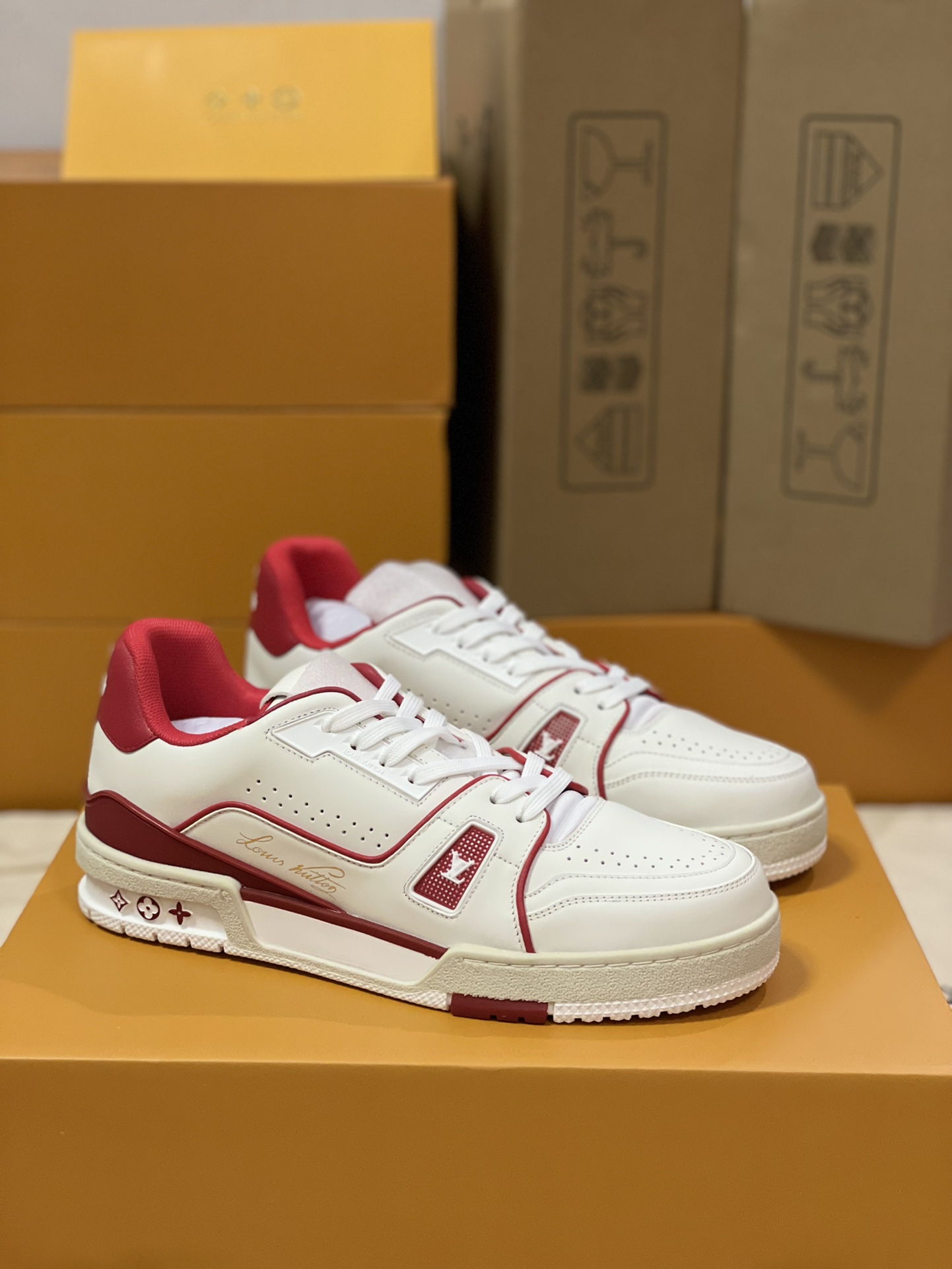 這款 LV 原單運動鞋採用紅白配色結合復古籃球鞋輪廓,鞋身浮雕Monogram標誌與側邊透明標貼細節,完整再現品牌質感。鞋墊回彈優良,整體輕盈,適合長時間穿著。多位客戶實穿回饋舒適穩定,評價一致推薦。