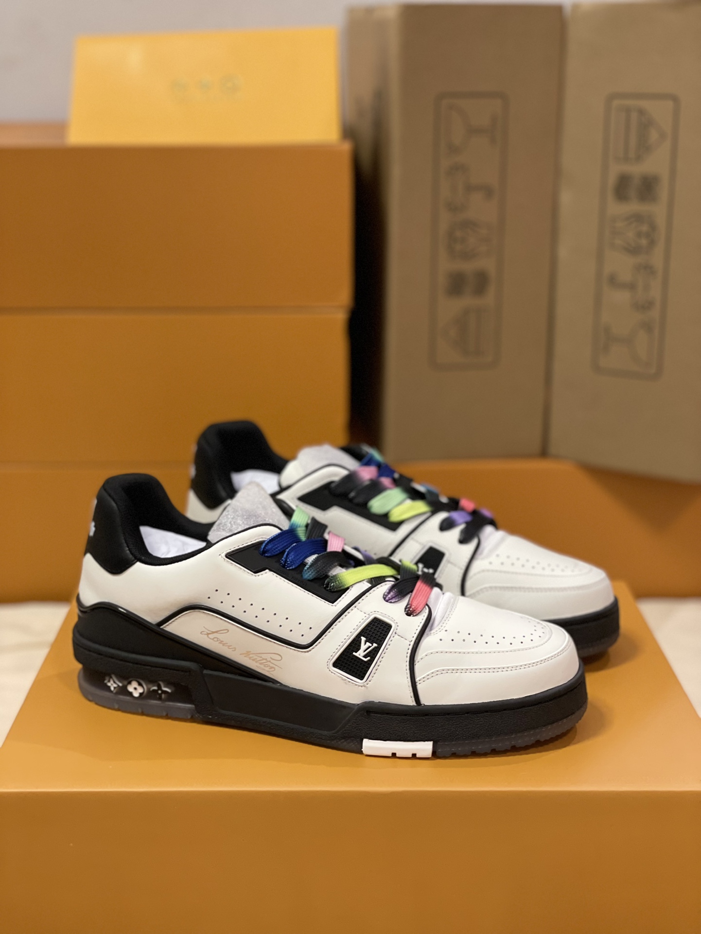 這款 LV A貨低筒運動鞋以白底配黑框為基調,加入彩虹漸層鞋帶設計,創造出搶眼又充滿年輕活力的街頭風格。鞋側標誌與鞋底Monogram壓印細節清晰可見,腳感舒適,透氣性佳,是近年備受潮人喜愛的LV經典升級版本,穿上即刻展現品味。