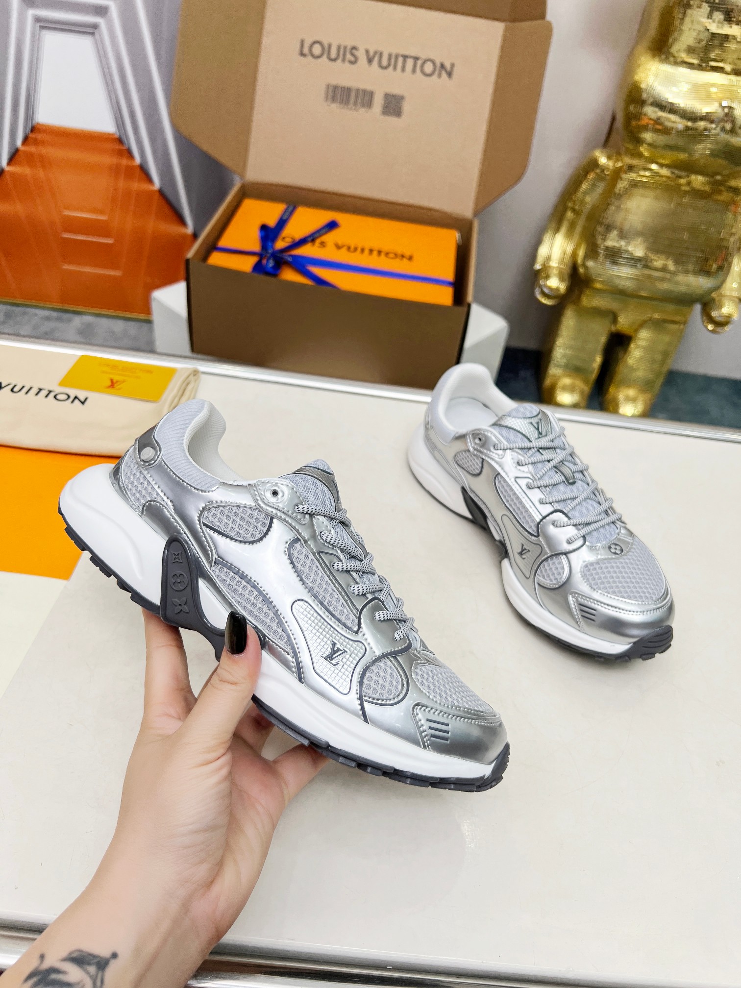 這款LV高仿銀色運動鞋,以亮面材質結合透氣網布,帶來時尚與功能兼具的設計。銀色鞋面極具未來感,搭配經典LV細節,展現獨特辨識度。鞋底結構強調防滑與舒適腳感,適合日常穿搭與運動場合。多位消費者反饋鞋型修飾腳型,穿著輕盈不累腳。這款設計完美對標專櫃工藝,呈現出精品級質感。