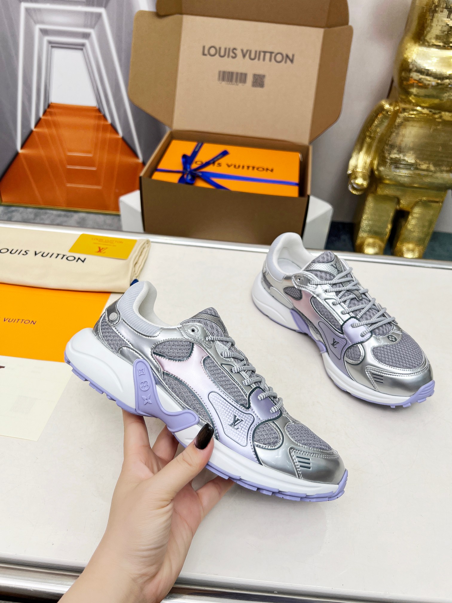 這款LV原單運動鞋以銀灰色為基調,拼接紫色元素,呈現獨特的層次感與時尚氛圍。鞋面採用透氣網布與亮面拼接材質,舒適與設計兼備。中底輕盈富有彈性,長時間行走不累腳,鞋底防滑穩定。LV標誌細節還原專櫃質感,工藝嚴謹。買家評價穿著體驗優異,無論是運動或街頭搭配,都能展現活力時尚感。