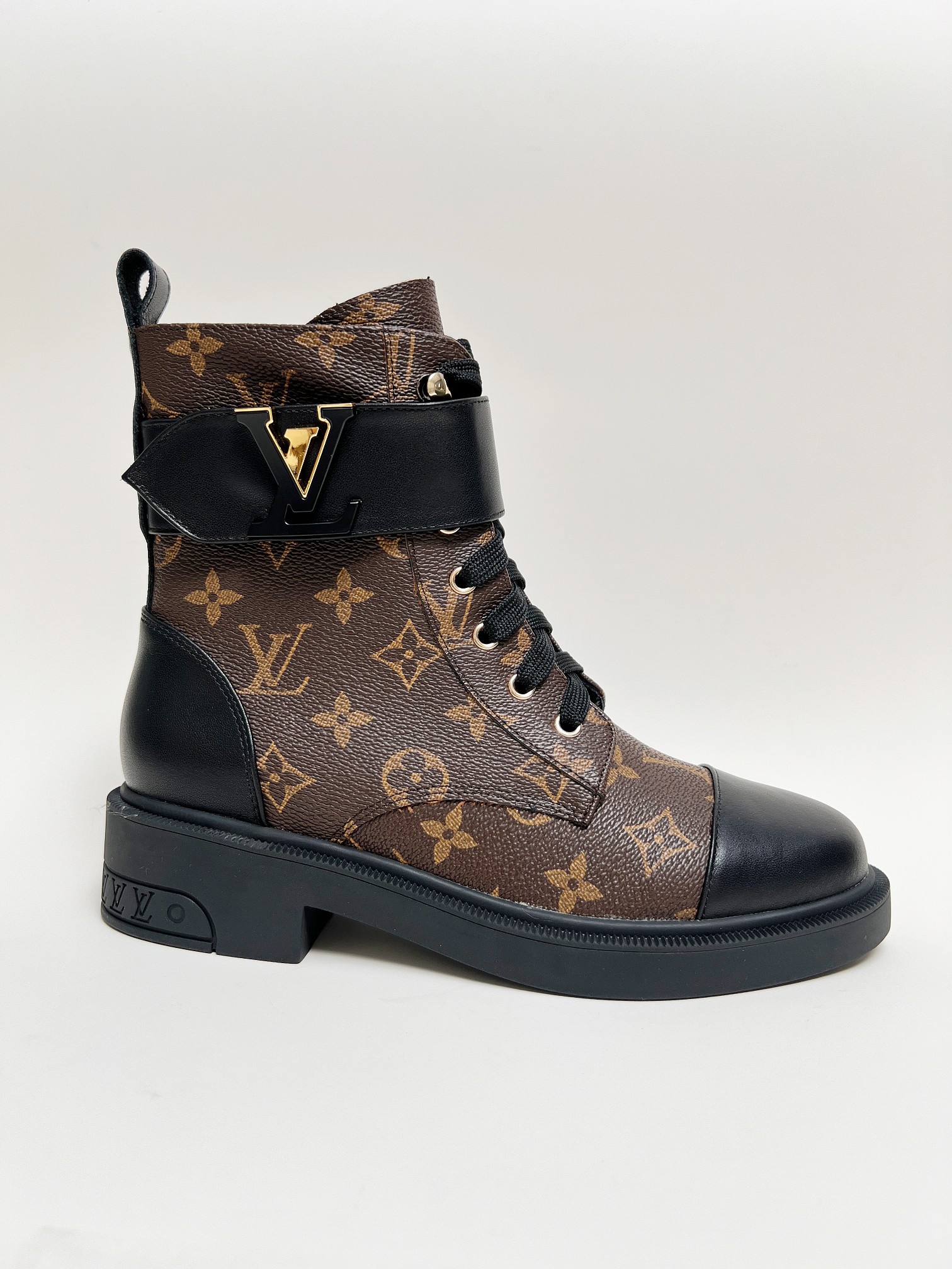 這款 LV 高仿短靴採用品牌標誌性老花帆布與黑色真皮拼接,搭配金屬 LV 扣環,設計精緻且充滿辨識度。鞋身綁帶設計搭配寬版皮革扣帶,既增添時尚感又提升穩固性。厚底橡膠鞋底防滑耐磨,兼顧舒適與實用。整體線條俐落大方,細節縫線工整,展現高仿精品的對標質感,無論是日常穿搭或秋冬街頭風格都能輕鬆駕馭。