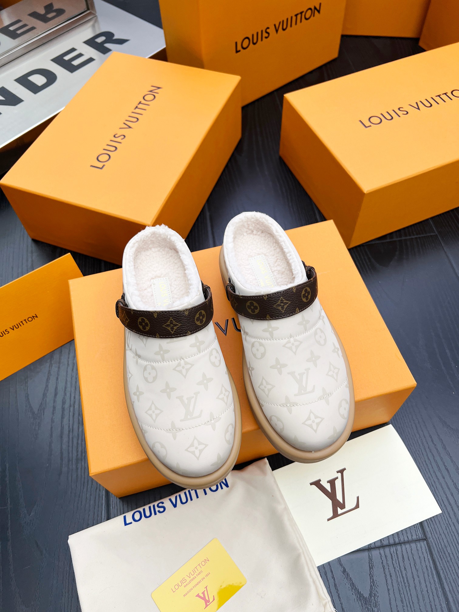 Louis Vuitton 原單羊羔絨穆勒鞋,以經典 Monogram 拼接白色鞋面設計,內裡鋪設柔軟羊羔絨,保暖與舒適兼具。鞋面印有經典壓紋 LV 標誌,質感細膩。外底選用輕量耐磨橡膠,適合秋冬日常穿著,無論居家或外出皆能展現時尚氣息。買家回饋:鞋款保暖效果佳,冬天單穿或搭配襪子都非常合適。