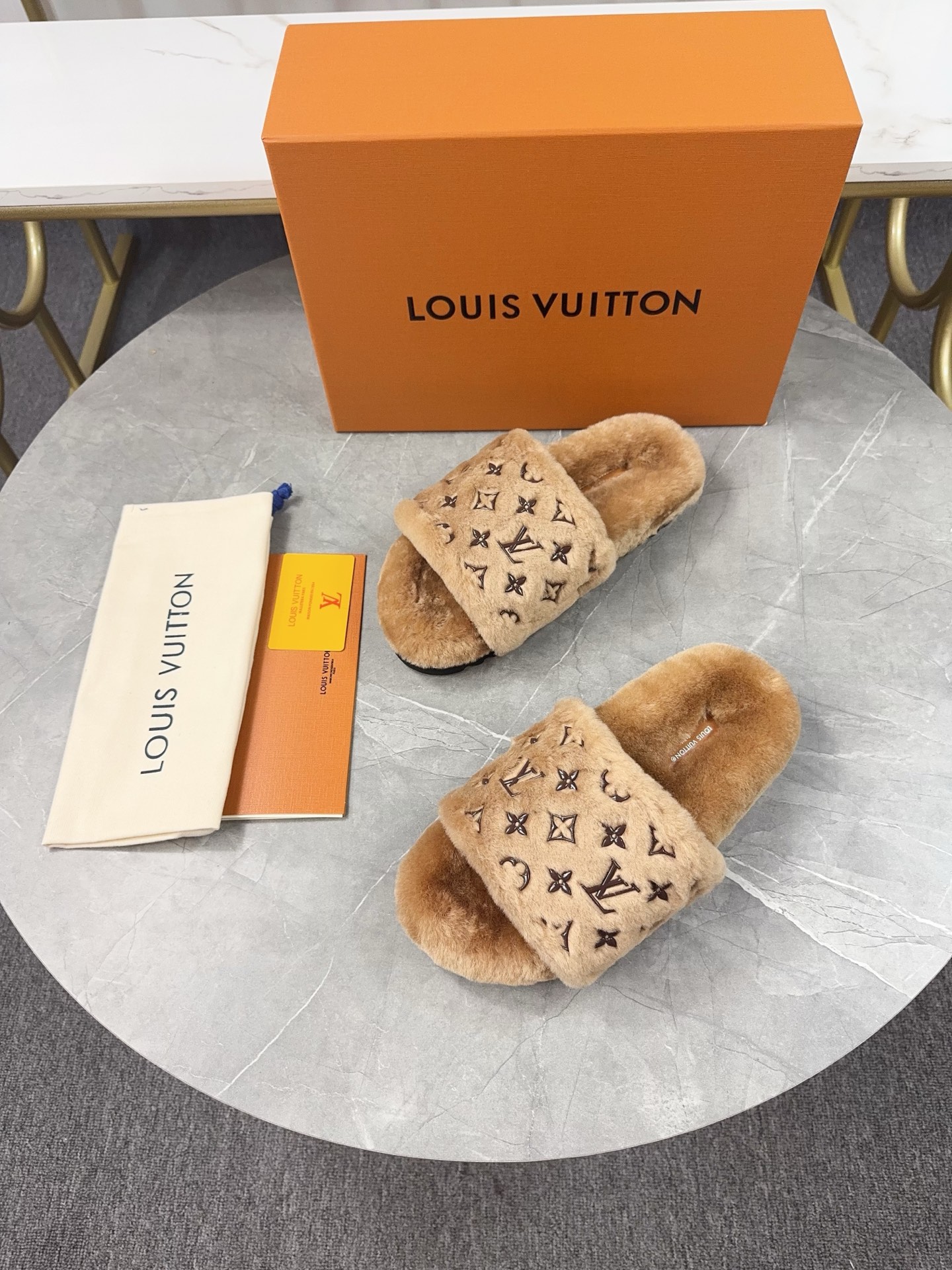 客人評價表示「質感厚實不軟塌,使用後回購意願高」。LV高仿女款毛毛拖鞋以淺駝色毛絨打造,鞋面綴以經典Monogram圖案,呈現出自然高級感。鞋底防滑設計適合多種場合使用,內裡柔軟貼合,長時間穿著依然舒適。這款高仿鞋外觀與專櫃款高度相似,兼具時尚感與實穿性,是秋冬必備的潮流單品。