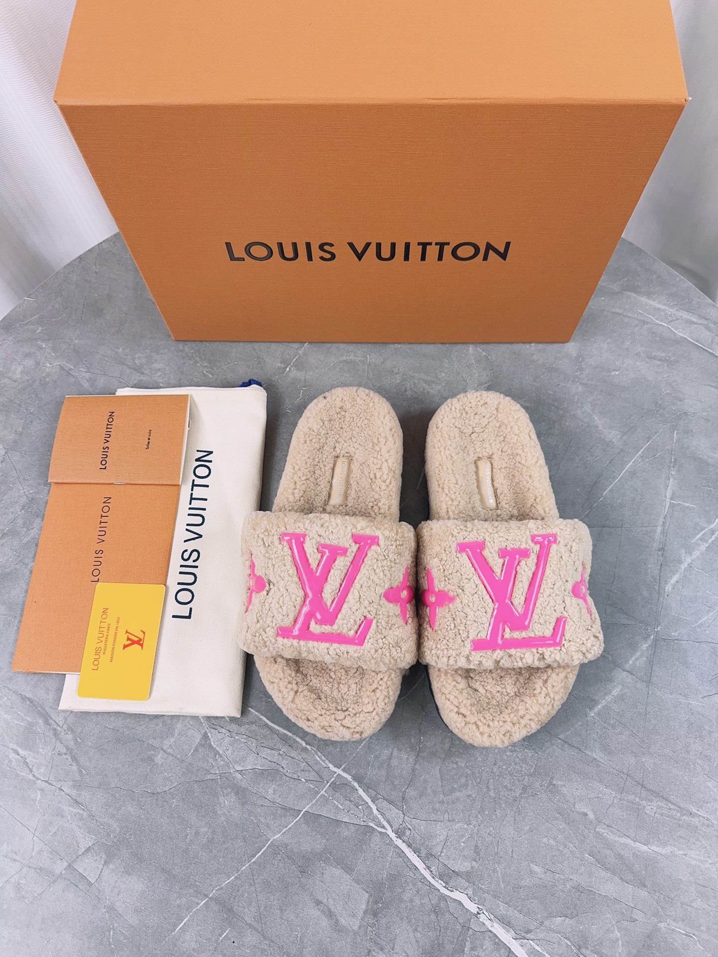 精選來自人氣熱銷款式,搭配性極高,不論居家或外出皆適合。這款LV高仿女款毛毛拖鞋以米色毛絨製成,鞋面搭配亮眼粉色Logo,設計感強烈。內裡柔軟舒適,鞋底輕盈防滑,多位消費者回饋實物質感優於預期。外觀與專櫃高度一致,是時尚與實穿兼具的高仿鞋。