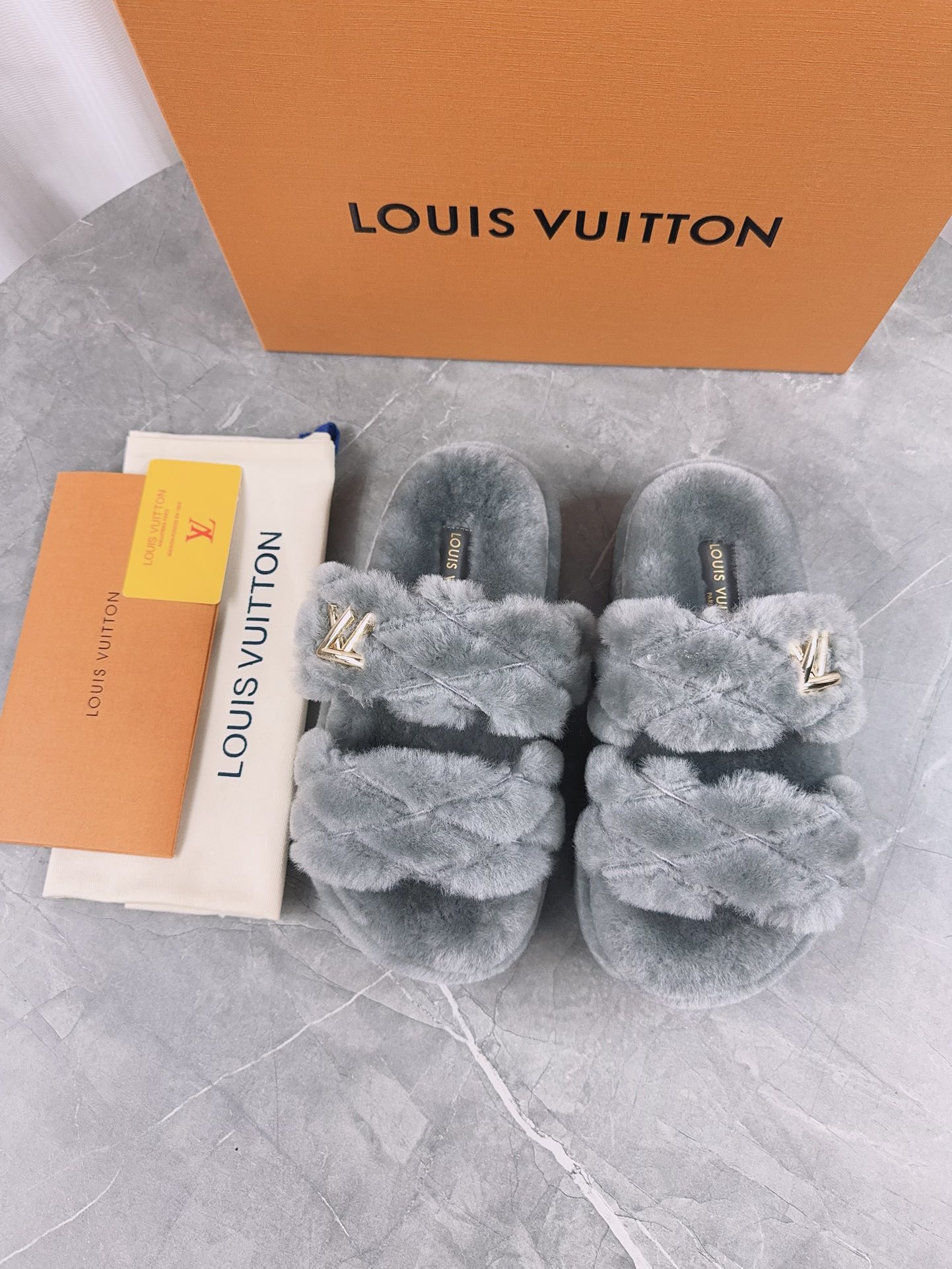 這款 LV 高仿灰色編織毛毛拖鞋以細膩柔軟的毛絨材質製作,鞋面交錯編織結構搭配金屬 LV 標誌點綴,呈現簡約而高雅的氛圍。舒適厚底設計結合冬日保暖與輕盈腳感,深受買家青睞。實際穿著回饋表示此鞋款不僅好搭配居家休閒裝束,也能在外出時保有低調奢華的時尚氛圍,是兼具質感與實用的選擇。