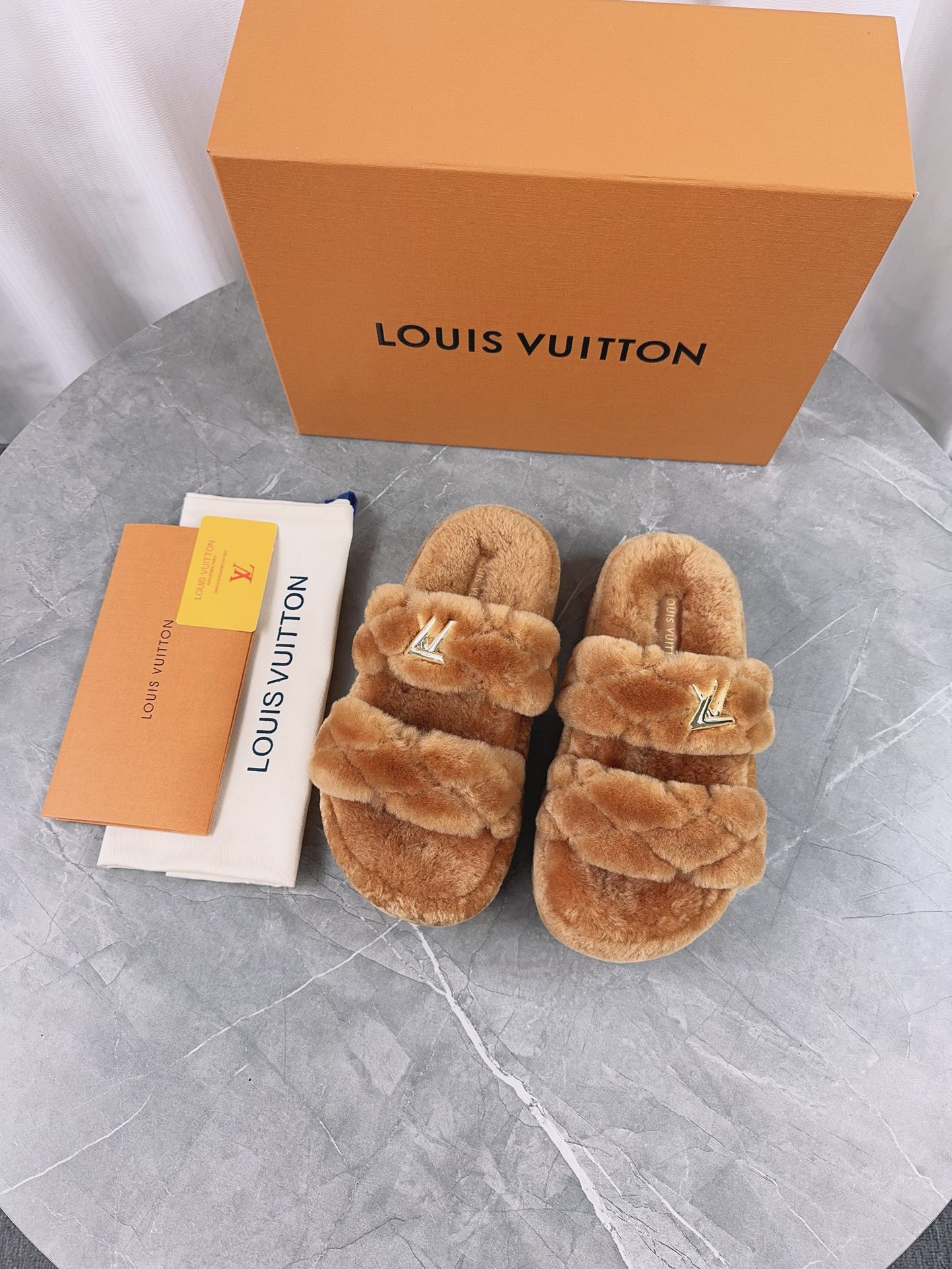 這雙 LV 高仿棕色編織毛毛拖鞋以自然大地色為基調,搭配交錯編織鞋面和 LV 金屬標誌,呈現溫暖大方的氣質。鞋款內裡柔軟舒適,能帶來良好包覆感,讓冬日出行或居家穿著都能感受奢華體驗。使用者分享指出,這雙鞋在質感與舒適度上均對標專櫃水準,整體完成度極高。 商品說明: