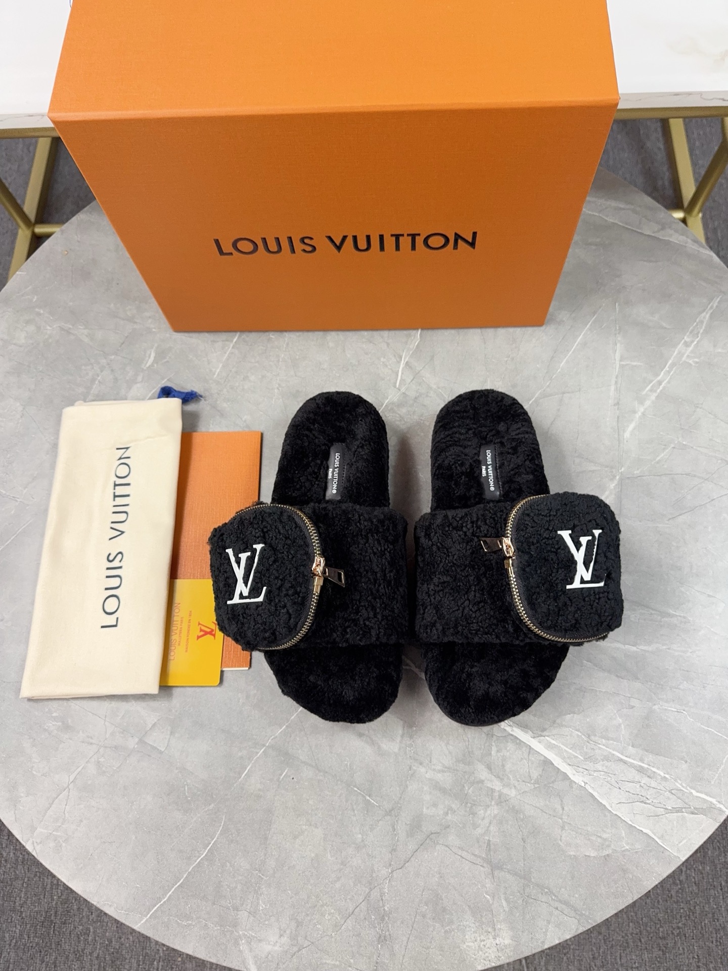 Louis Vuitton 高仿羊羔絨拖鞋,經典黑色展現沉穩氣質。鞋面搭配迷你口袋拉鍊,既有裝飾感也兼具小物收納功能,設計新穎。柔軟羊羔絨材質帶來舒適溫暖的穿著體驗,厚實鞋墊與防滑鞋底,適合日常居家與外出休閒。黑色款更顯百搭,四季皆可穿著。