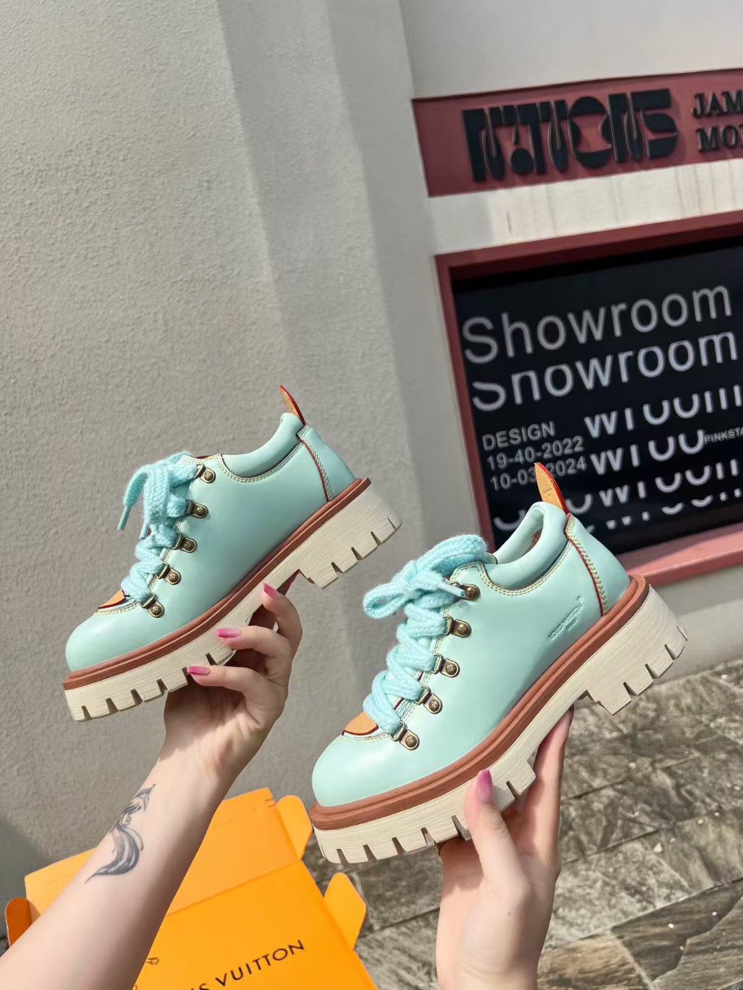 Louis Vuitton 一比一厚底休閒鞋,薄荷綠配色清新獨特,搭配亮眼橘色細節與木質感厚底,設計感十足。鞋面採用優質皮革,細膩光澤與舒適觸感兼具,金屬鞋眼搭配繩帶設計,凸顯品牌質感。厚實齒狀鞋底提供穩固支撐與耐磨性能,穿著輕盈不失穩定。無論日常休閒或潮流穿搭,皆能展現活力與時尚氣息。