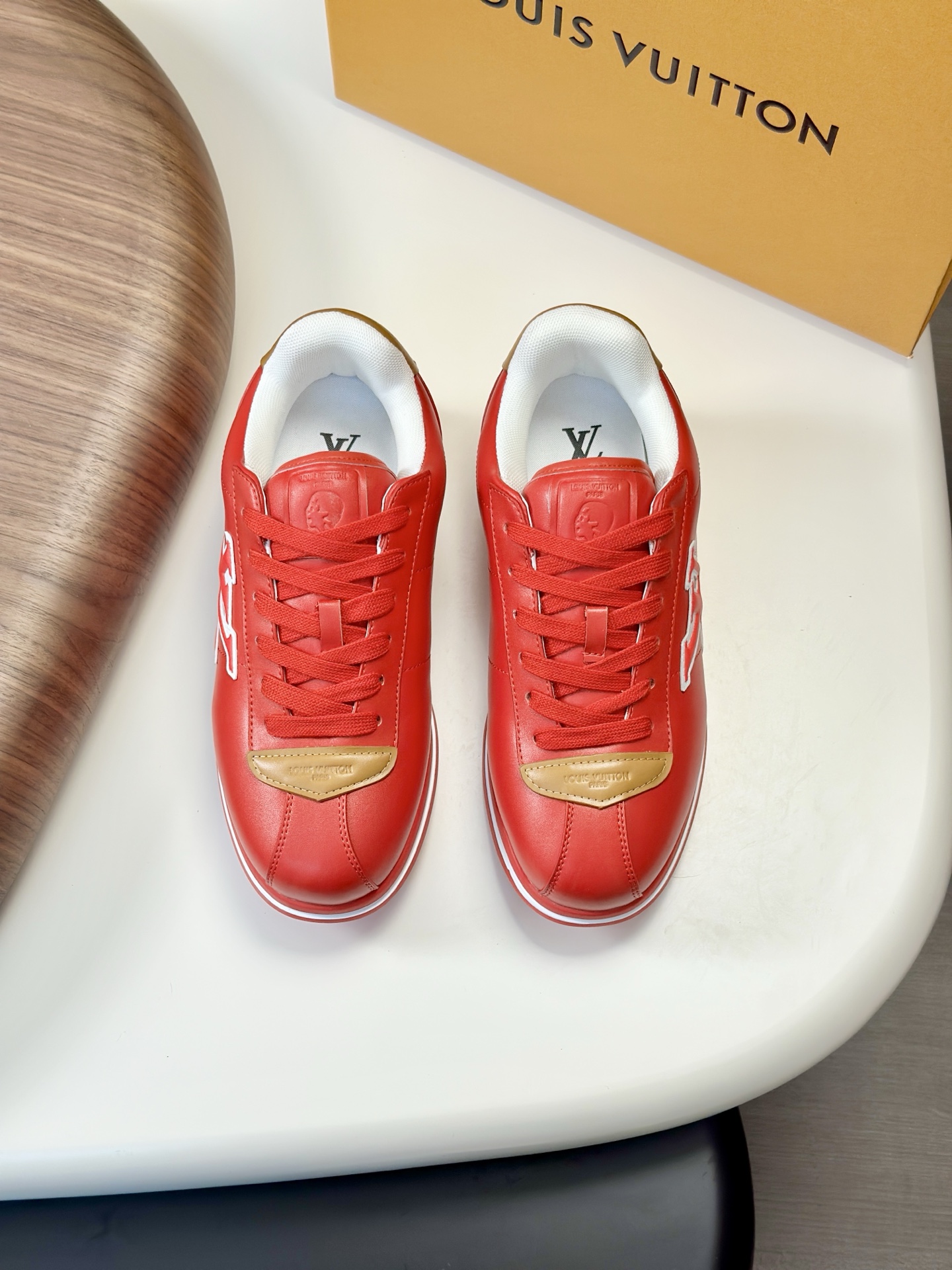 Louis Vuitton 高仿運動鞋,以鮮豔亮紅色小牛皮製作,展現活力與張揚個性。鞋舌浮雕 LV 標誌,鞋側拼接白色 LV 字母,搭配焦糖色鞋頭皮革點綴,細節考究。鞋墊柔軟回彈,橡膠鞋底耐磨防滑,兼顧舒適與實用。紅色鞋身搭配經典元素,無論日常休閒還是街頭時尚穿搭,都能成為吸睛焦點。