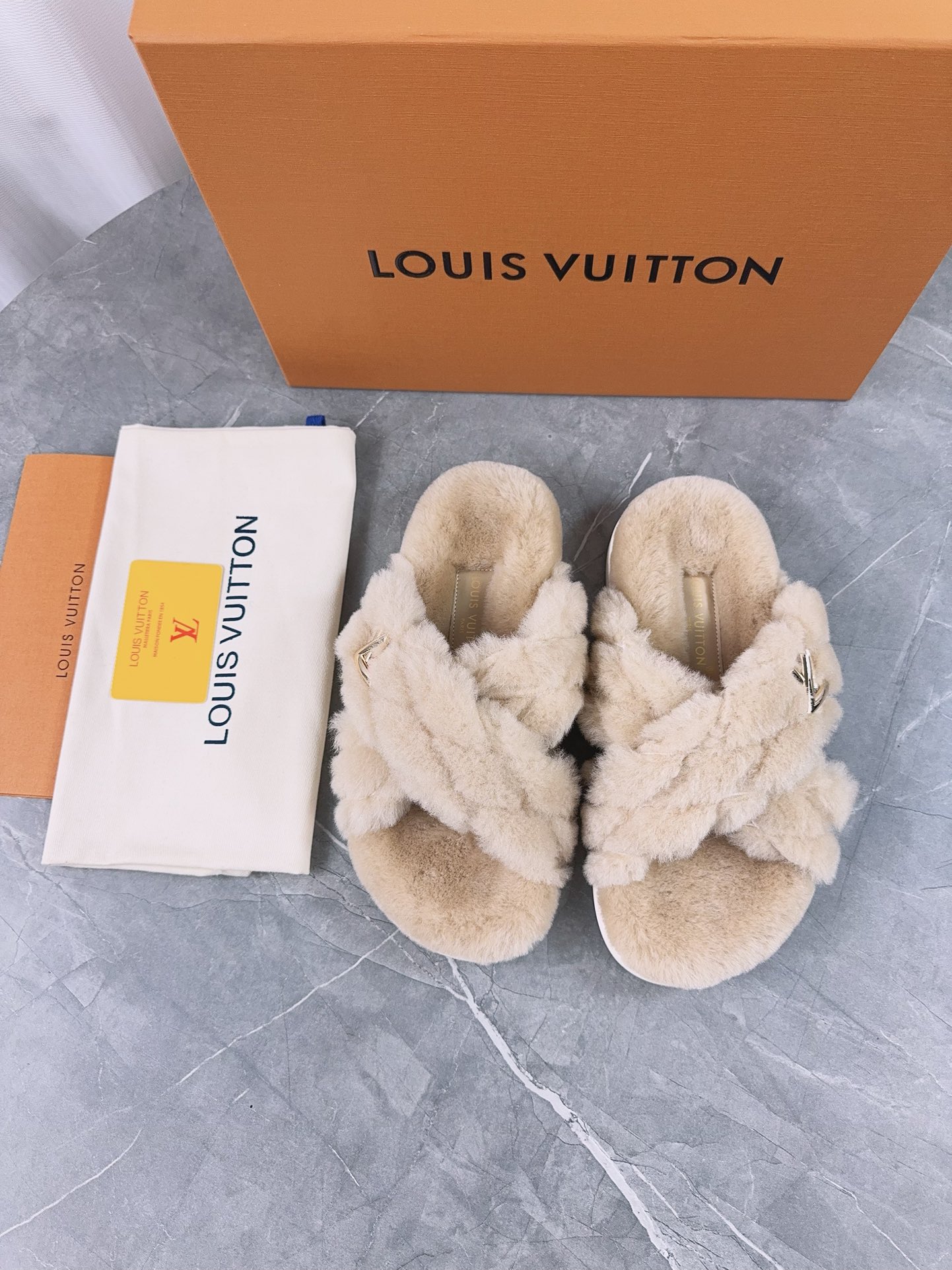 這雙 LV 高仿毛絨交叉拖鞋以米色毛絨設計,結合經典交叉鞋面與金屬 LV 標誌,整體大方百搭。鞋底厚實柔軟,長時間穿著仍能保持舒適。買家回饋指出,此米色款不僅好搭配日常服飾,也具備專櫃級質感。